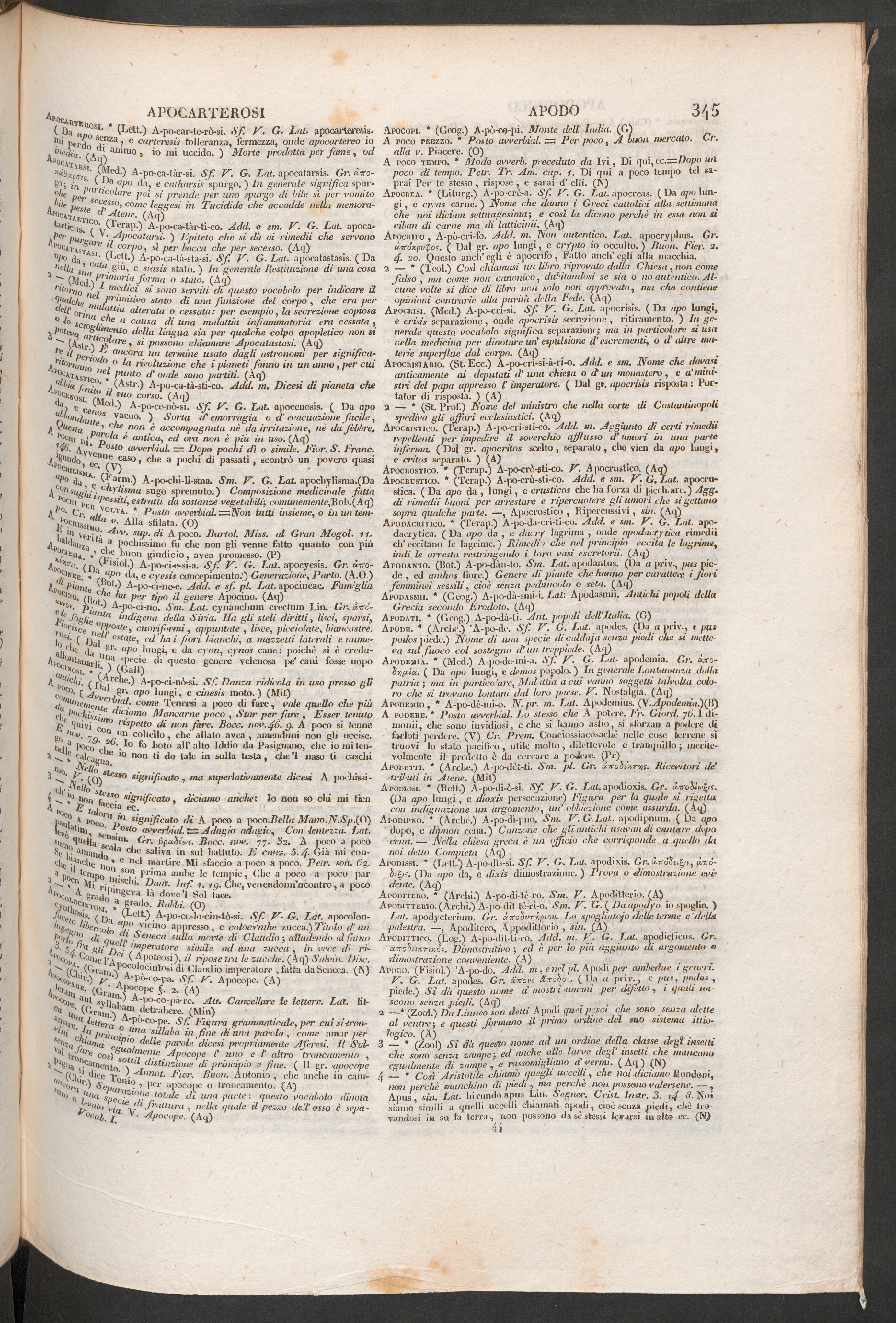 ApodemiÀ. * (Med.) A-po-de-mi-a. Sfi E". G. Lat* anodemia. Gi\ à#o-àrigtct, ( Da apo lungi, c demos popolo.) In generale Lontananza dallapatria } ma in particolare, Alaiitila acuì vanno soggetti talvolta colo-re che si trovano lontani dal loro ptw.se. E~. Nostalgia. (Aq )Apodemio, * A-po-dé-mi-o. N. pr. m. Lat. A |>odeinius, (V. Apodemiai) (B)A podere. * Posto avverbùd. Lo stesso che A polire, l'r. Giord. 76.1 tii-mouii, che sono invidiosi, colie si hanno astio, si sforza» a podere difintoti perdere. (V) Cr. Proni. Conciossiacosaché nelle cose terrene sìtruovi lo stalo pacifico, utile molto, dilettevole e tranquillo; merite-volmente il predetto é da cercare a juidcic. (}V)