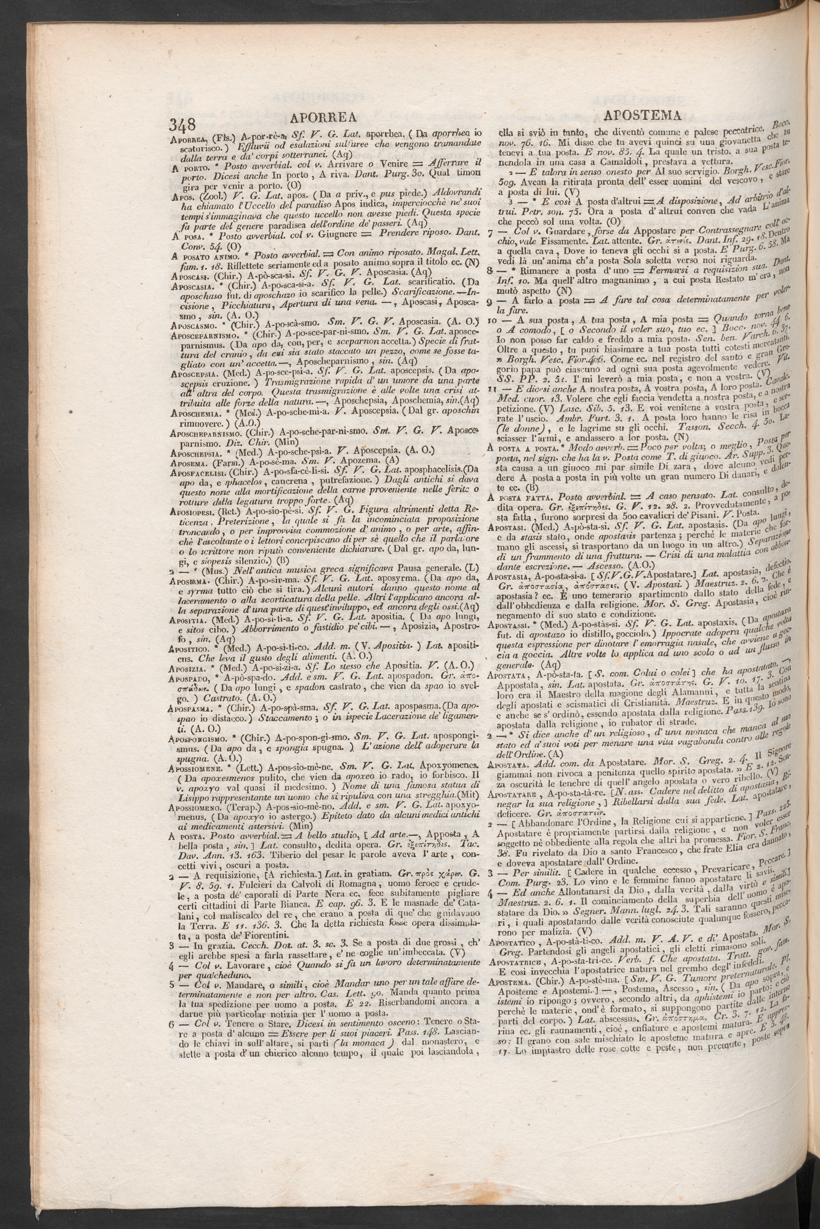 A posta fatta. Posto avvcìbial. z=z A caso pensato . Lat. consu*^^dita opera, Gr. sgcjr'/rTj^ic. G. P. 12. 28. 2. Provvcdut;iment c »sta fatta, furono sorpresi da 5 oo cavalieri de* Pisani. P. Posta. * ul igi >Apostasi. (Mcd.) Aqiò-sta-si. Sf P. G. Lat. apostasis. (Da ^I ,0 a ìC fe f 'e da stasis stato, onde apostasis partenza ; perchè le materie ra fi*mano gli ascessi, si trasportano da un luogo in un altro.) Se\ ,<ldi un frammento di una frattura• — Crisi di una malattia c0Tldante escrezione. — Ascesso. (A.O.) ^ . ( ]efc c ^