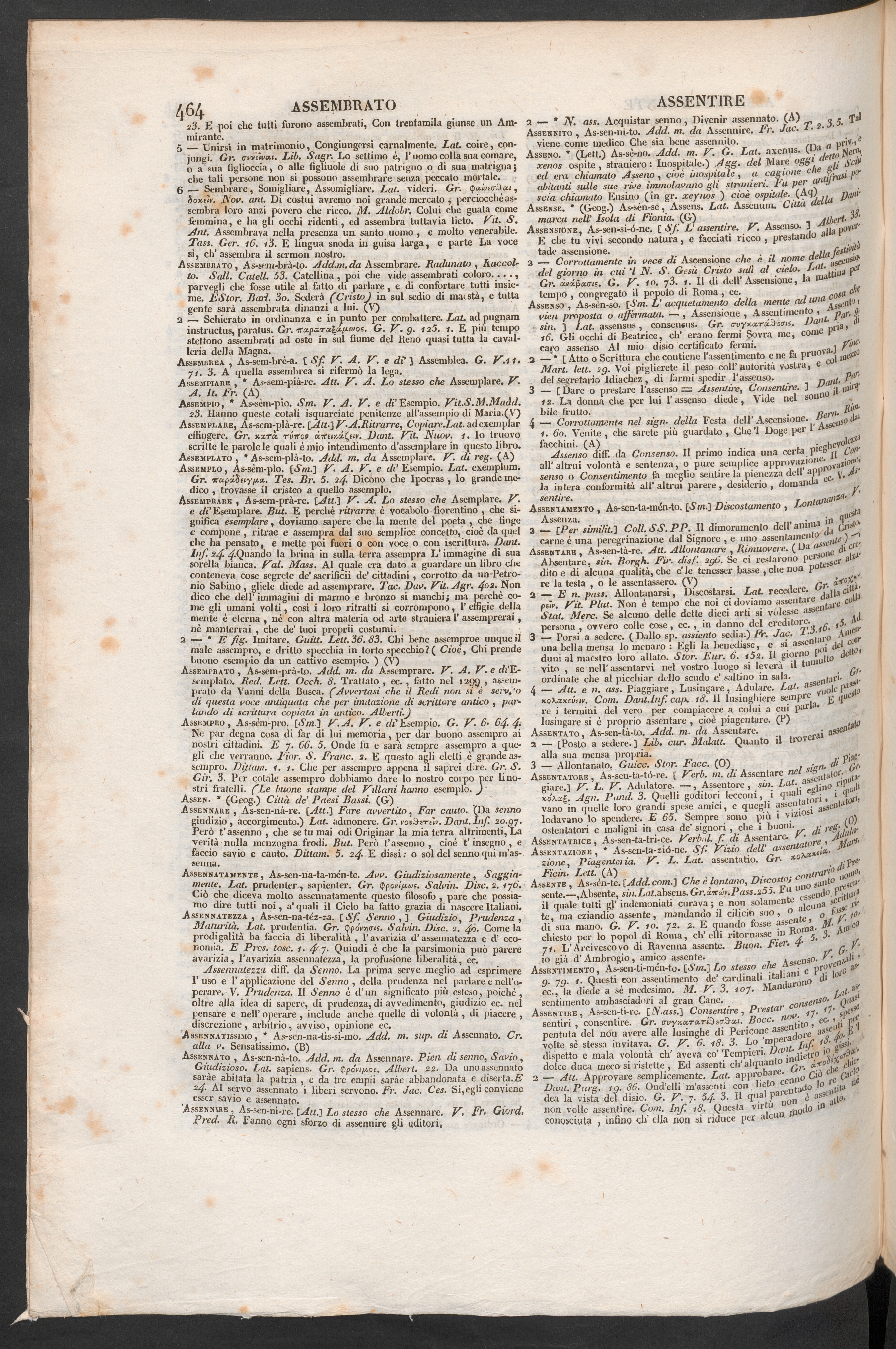 Assembrato, As-scm-prà-to. Add. m. da Assemprarc. V- A. V-edi E-snnplato. Red. Leti. Occh. 8. Trattato , ec. , fatto nel 1299 , assein-prato da Vanni della Busca. (Avvertasi che il Redi non si è seiv/odi questa voce antiquata che per imtUizione di scrittore antico , par-lando di scrittura copiala in antico. AUerli.JAssembro, As-sém-pro. [Am.] V. si. V. e di' Esempio. G. V- 6• 64 - 4 •Ne par degna cosa di far di lui memoria, per dar buono assempro ainostri cittadini. E 7. 66. 5 . Onde fu c sarà sempre assempro a que-gli che verranno. Rior. A. Frane. 1. E questo agli eletti è grande as-sempro. Dipani. 1. 1. Clic per assempro appena il saprei dire. Gr. A.Gir. 3 . Per colale assempro dobbiamo dare lo nostro corpo per li no-stri fratelli. fLe buone stampe del Villani hanno esemplo. JAssen. * (Geog.) Città de’ Paesi Bassi. (G)