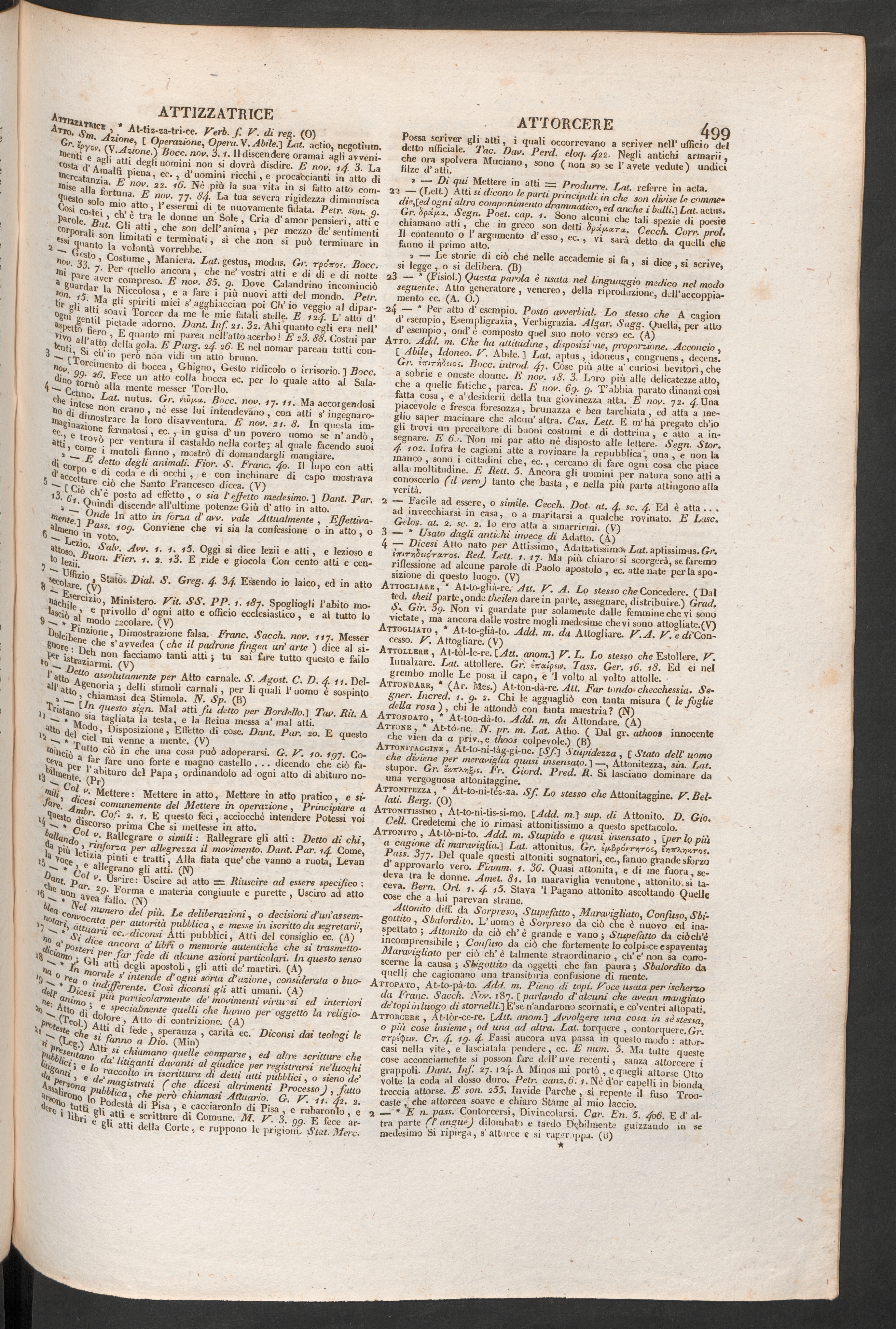 Attonito , At-tò-ni-to. Add. tri. Stupido e quasi insensato , [per Iq piùa cagione di maravigliti.] Lai. affonitus. Gr. fAfii r-rj-roc, ejisrAijuror.Pass. 3 yy. Del quale questi attoniti sognatori, cc., fanno glande sforzod’approvarlo vero. Fiiunm. 1. 36 . Quasi attonita, e di me fuora, se-deva tra le donne. Amet. 81. In maraviglia venutone, attonito.si ta-ceva. Rem. Ori 1. 4■ f 5 . Stava ’l Pagano attonito ascoltando Quellecose che a lui parevan strane.