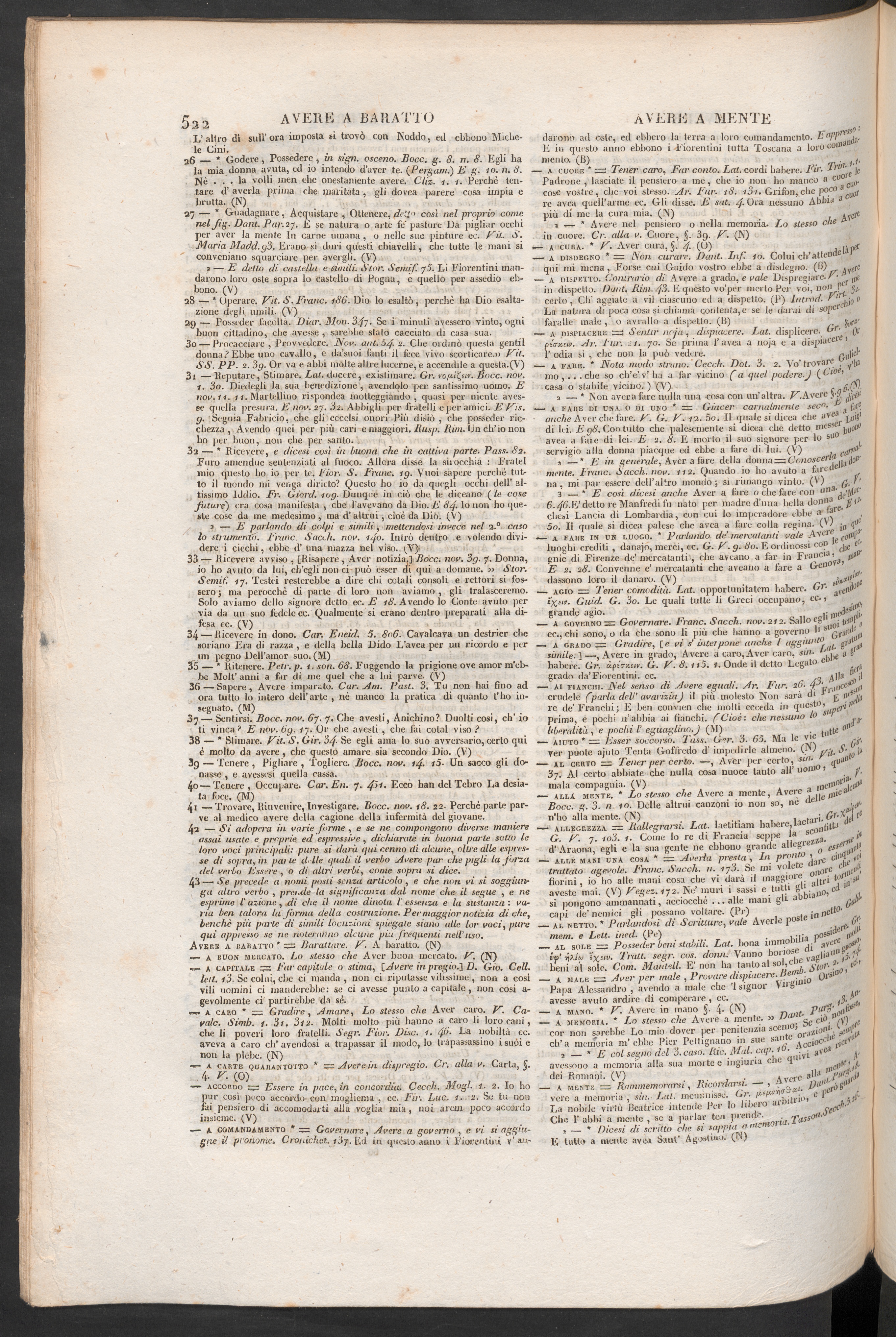 — a caro * = Gradire , Amare , Lo stesso che Aver caro. V. Ca-vale. Simb. 1. 3i. 3i2. Molti molto più hanno a caro li loro cani,che Ji poveri loro fratelli. Segr. Fior. Disc. 1. Ea nobiltà ec.aveva a caro eh’ avendosi a trapassar il modo, lo trapassassino i suoi enon la plebe. (N)