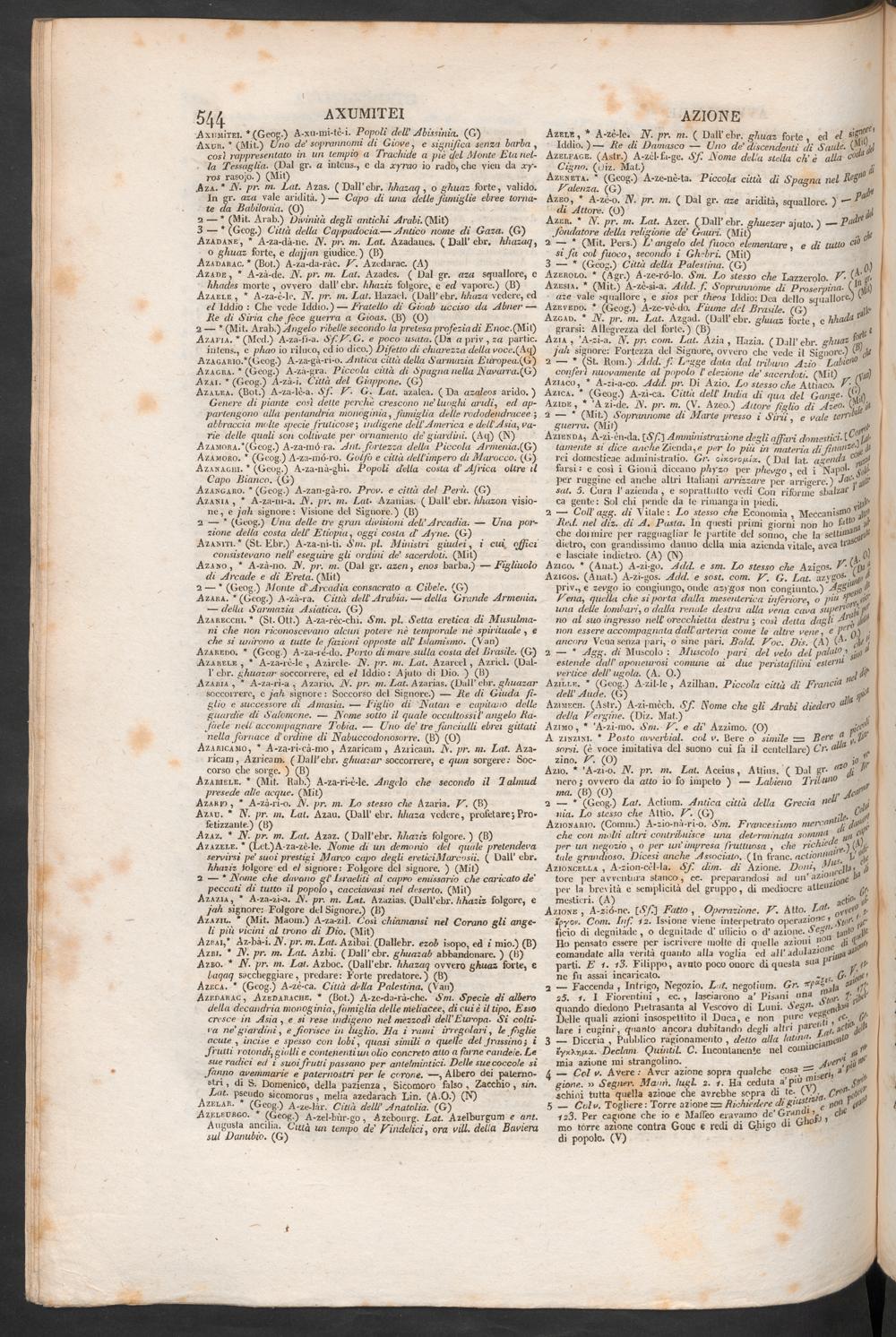 Aziaco, * A-ri-a-co. Add. pr. Di Azio . Lo stesso che Attiaco. V-kAzica. * (Geog.) A-zi-ca. Città dell India di qua del Gange . (‘VaAzide , * ’A zi-de. ZV. pr. m. (V. Azeo.) Attore figlio di Azeo. (-Vji2 — * (Mit.) Soprannome di Marte presso i Sirii e vale tcfl'b 1guerra. (Mil) _ _ /