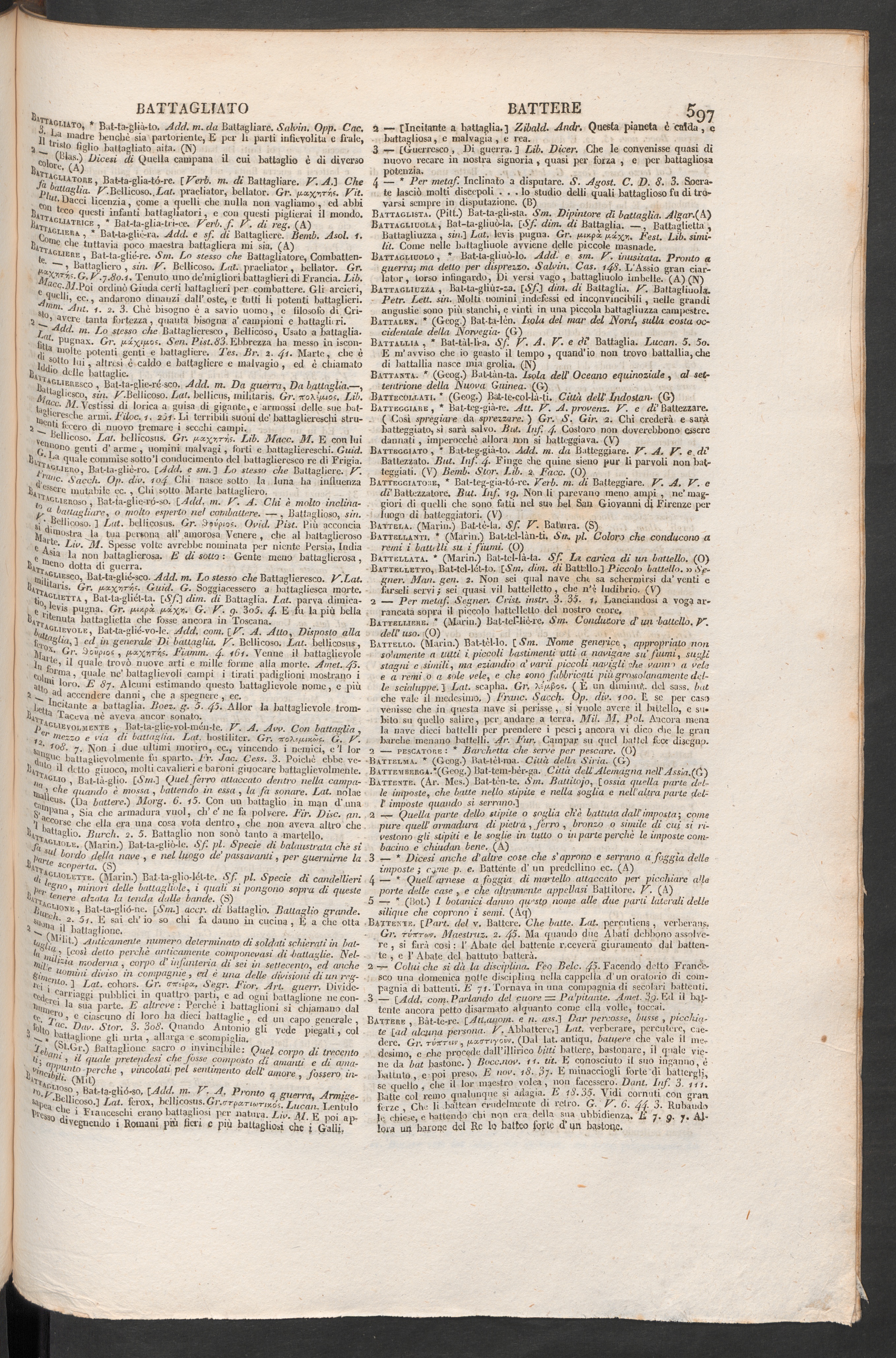 ^clieroso , Bat-ta-glie-ró-so. [Add. in. V. A. Chi è molto inclina-y “ battagliare, o molto esperto nei combattere. — , Batlaglioso, sin.si V Bcili coso. ] Lat. bellicosus. Gr. Aséfuos. Ovili. Pist. Più acconciajq d'Uiustra la tua persona all’ amorosa Venere , ebe al baltaglicrosoe Liv. 31. Sjiessc volte avrebbe nominata per niente Persia, India d.sia la non battaglierosa. E di sotto : Gente meno battaglierosa,tU-ri ct>0 dotta di K ul - 1Ta -