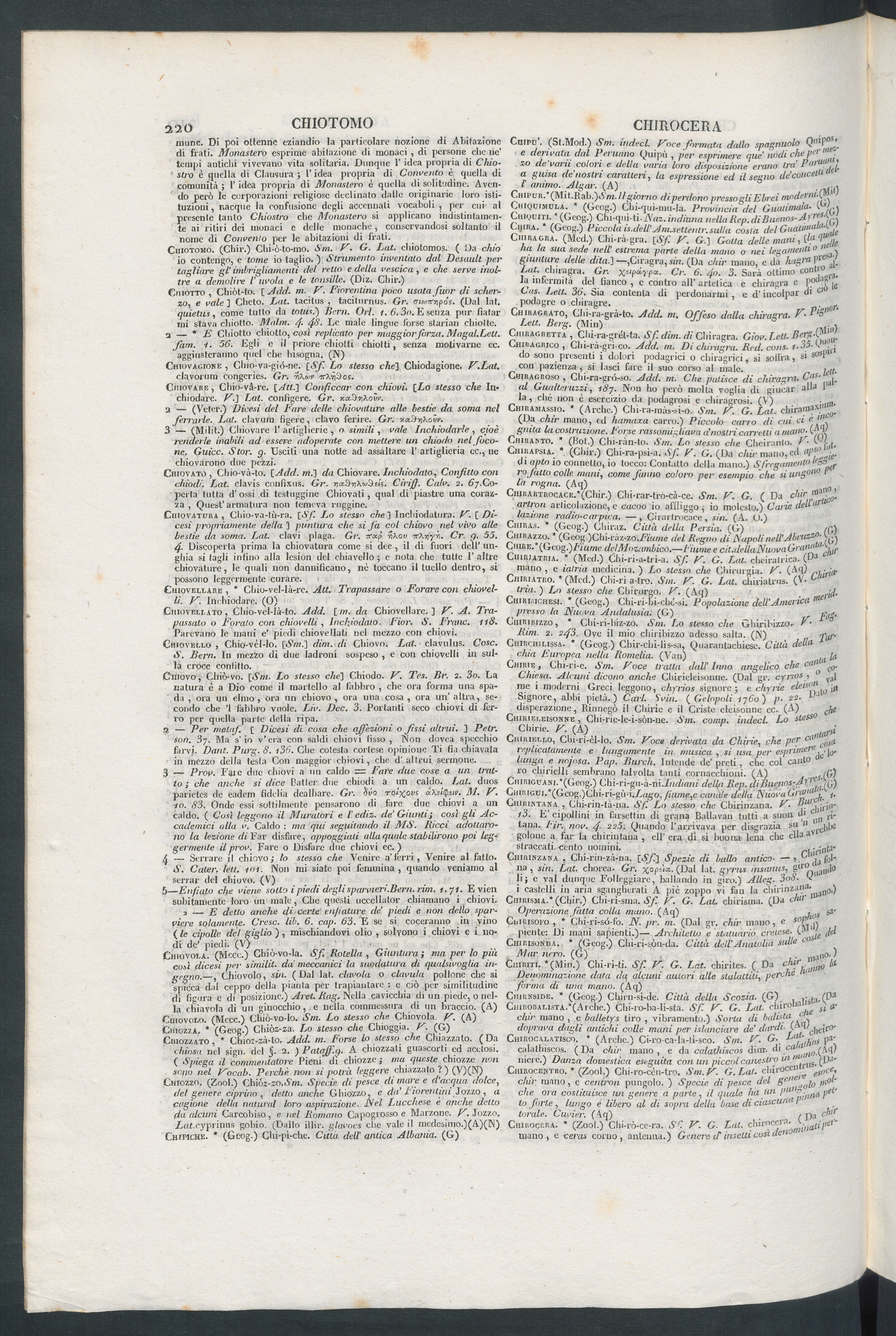 Chirajiassio. * (Arche.) Clu-ra-màs-si-o. Sm. f~. G. Lai. chiram-w. 111 '(Da chir mano, ed hamaxa carro.) Piccolo carro di cui ci e (giula la costruzione. Borse rassomigliava a’nostri carrelli a mane. (ojVChibakto. * (Bot.) Chi-i'an-to. Sm. Lo stesso che Cheiranlo. L^- \ ■ l,Chirapsxa. * (Chir.) Chi-ra-psi-a. Sf. F. G. (Da chir mano, eddi apto io connetto, io tocco: Contatto della mano.) Sfregamento legoro fiuto colle, muni , come fanno coloro per esempio che si ung 0110 "la rogna. (Aq)
