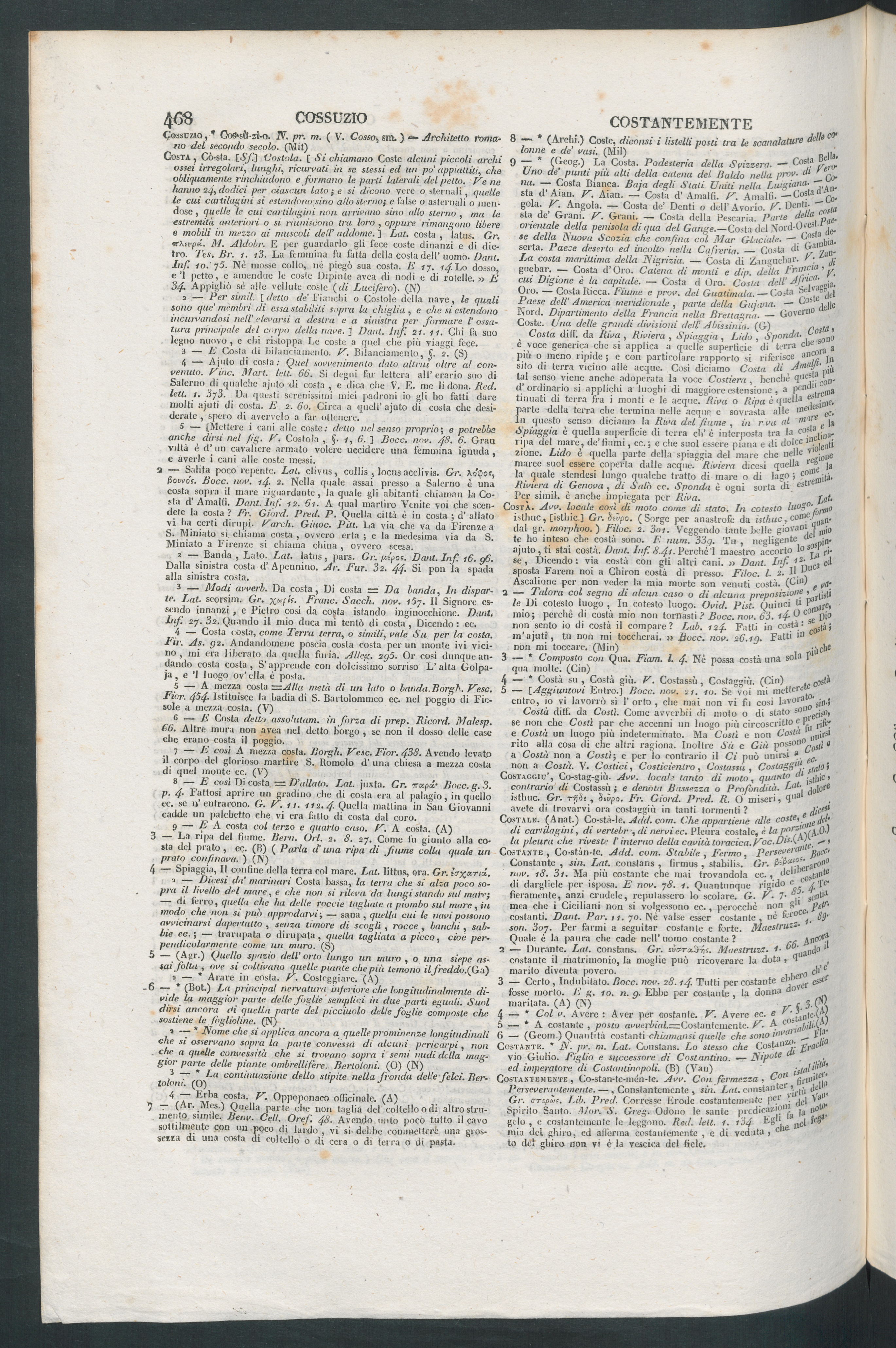 8 — E così Di costa = Vallato. Lat. jnxta. Gr. «rapai* Bocc. g. 3 .p. 4 • Fattosi aprire un gradino che di costa tra al palagio, in quellocc. se u’entrarono. G. V.11. 112.4 • Quella mattina in Sau Giovannicadde un palchetto che vi era fatto di costa dal coro.