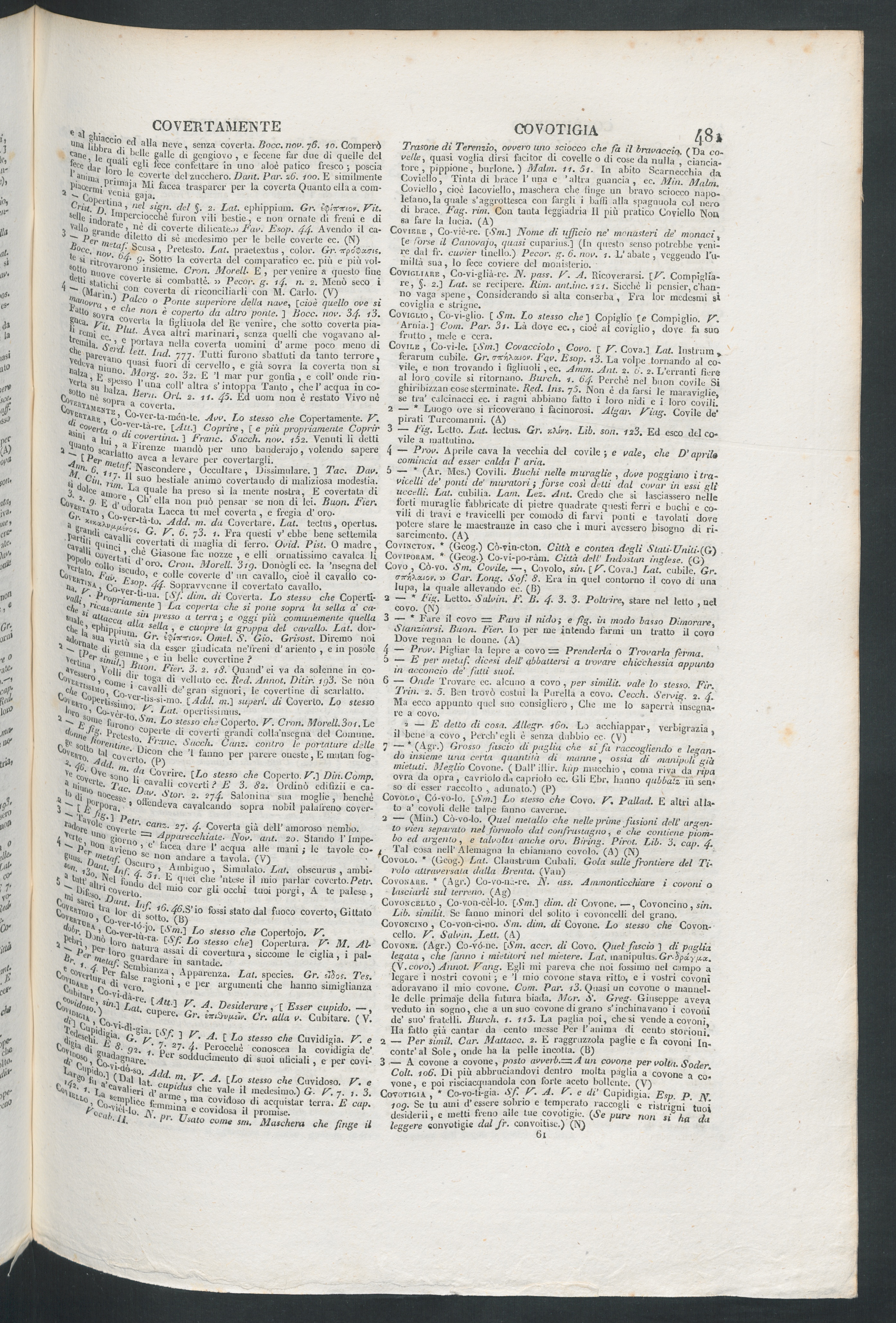 y. " 3 . 1. Era questi v’ebbe bene settemilaJ ar, ìli qninc' 1 ' . c ° verta ti ‘li maglia di ferro. Ovìd. Pisi. 0 madre,tm Va coven.1- c Ciasone fac nozze , e elli ornatissimo cavalca UVt ,P°ta collo • d oro - Cron. Mordi. 3 ir). Oonògli ec. la ’nsegnadelCo V6 r,at °. Lai, ‘T^ % C0 ^ e cover,c '1 lln cavallo, cioè il cavallo co-C :/-T 44 - Sopravvenne il covertalo cavallo.v n 'n- • è , i u ,j,. Ver " ll ' lla ' C l V/> rtó«. di Coverta. Lo stesso che Coperti-c l, ‘’ ri Cas " ‘‘"nenie ] La coperta che si pone sopra la sella a' ca-H, 8 . s ‘ UU UCC [‘ ù i S ‘ U l ,r,!sso a terra ; e oggi più comunemente tpiellarlii'i’ 'T'biiiin U ' L f e ^ a ) e cuopre la groppa del cavallo. Lat. dor-fldo. 8l *a virc“'. Gr ‘ Omd. S. Gio. Grisost. Diremo noi