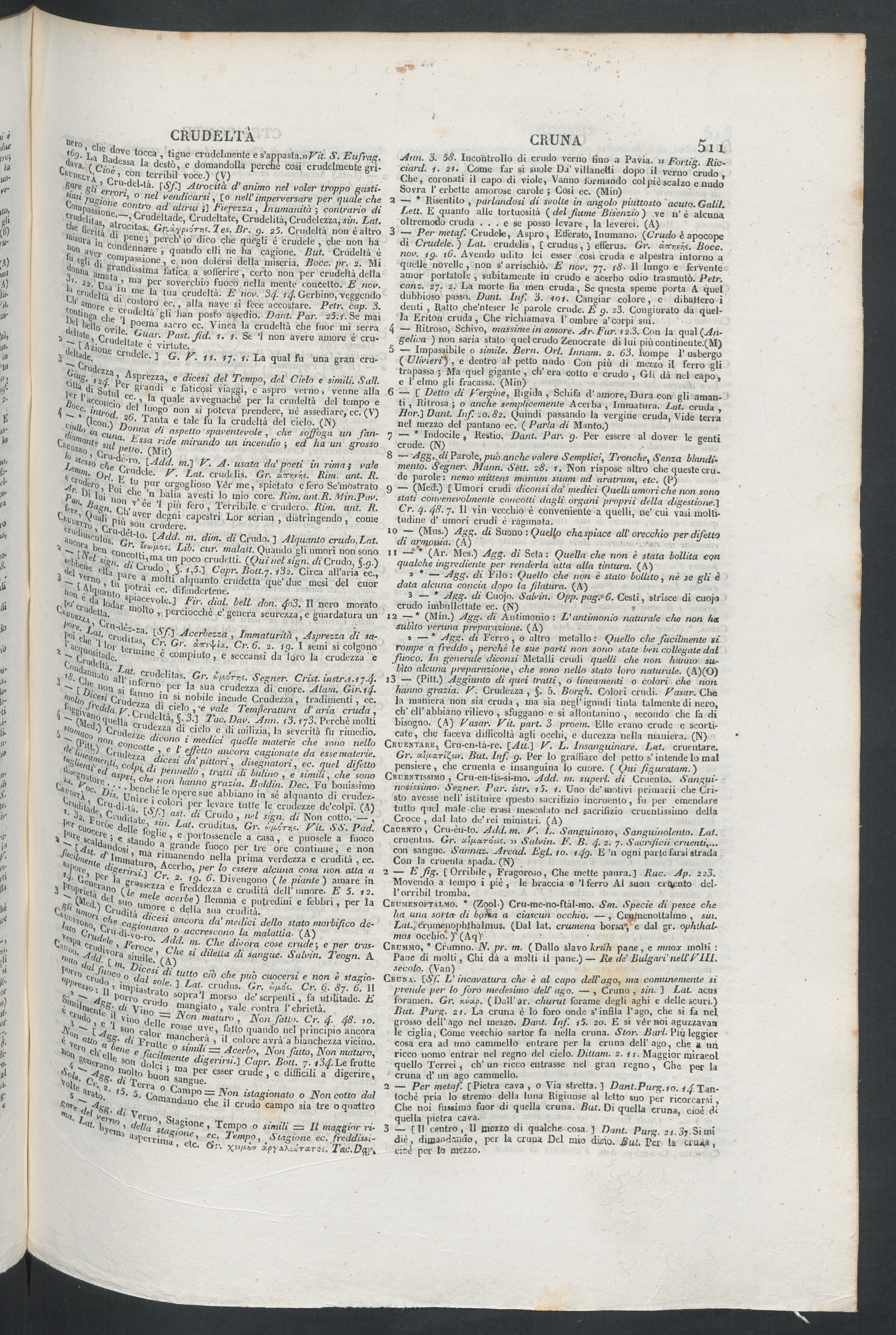 3 — Per metaf. Crudele, Aspro, Efferato, Inumano. {Crudo è apocopedi Crudele. ) Lai. crudelis , [ crudus, 1 efferus. Gr. à-xr,rrfi. Bocc.nov. ig. i(>. Avendo udito lei esser così cruda e alpestra intorno aquelle novelle , non s’arrischiò. E nov. 77. 18- Il lungo e ferventeamor portatole , subitamente in crudo e acerbo odio trasmutò. Petr.canz. 27. 2. La morte fìa men cruda, Se questa speme porta A queldubbioso passo. Dant. Inf. 3 . sol. Cangiar colore, e dibatterò identi , Ratto che’nteser te parole crude. È g. z 3 . Congiurato da quel-la Eriton cruda, Che richiamava P ombre a’corpi sui.
