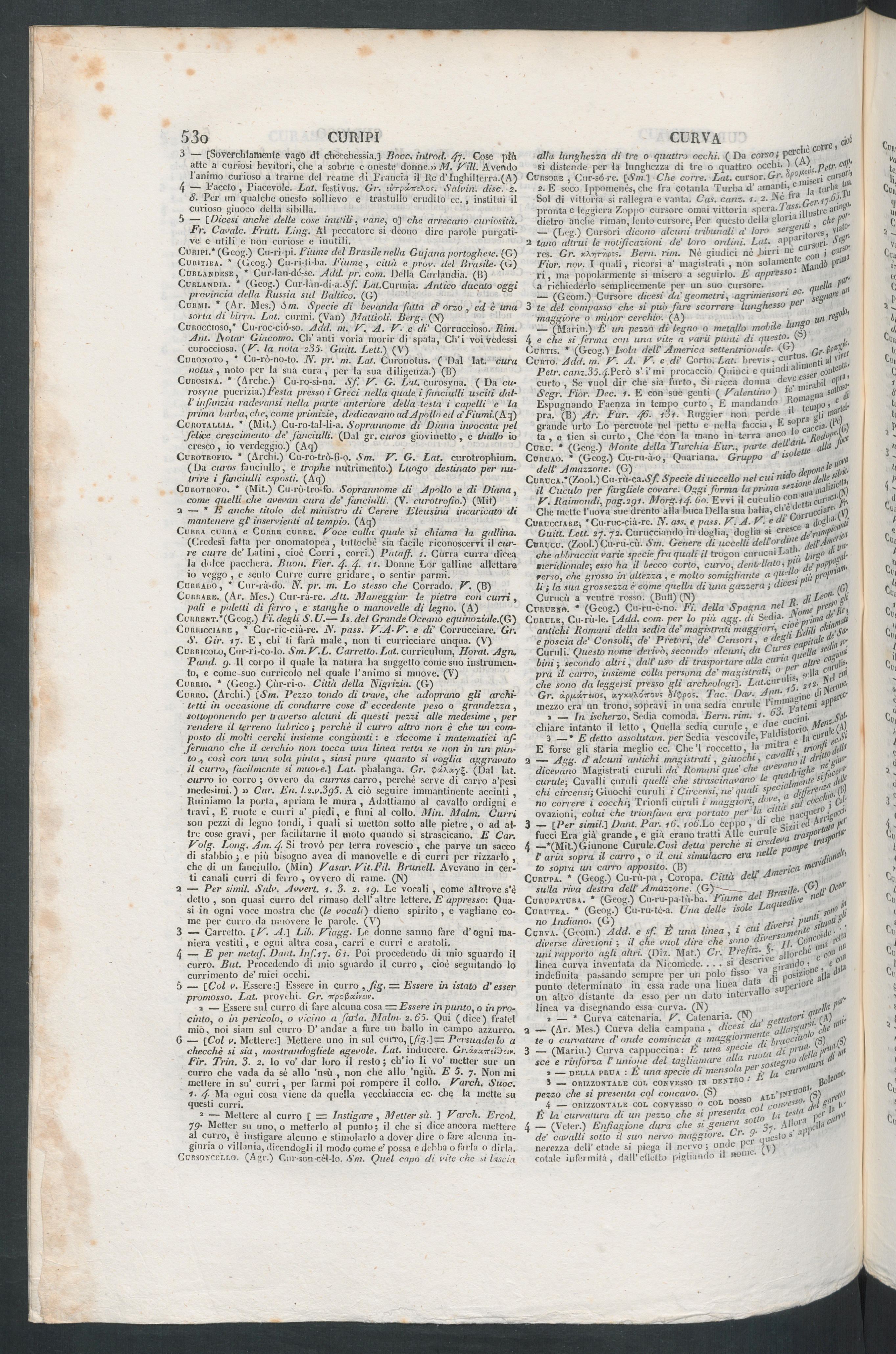 11 curn>, facilmente si muove.} Lat. phalunga. Gr. <pa\ay£. (Dal lat.curi'o io corro; ovvero da currus carro, perchè serve di carro a’pesimedesimi.) » Car. En. I. 2 .v. 3 g 5 . A ciò seguire immantinente accinti ,Riuniamo la porla, apriaiu le mura , Adattiamo al cavallo ordigni etravi, E ruote e cmri a’ piedi, e fimi al collo. Min. Maini. Currison pezzi di legno tondi, i quali si uictton sotto alle pietre , o ad al-tre cose gravi, per facilitarne il moto quando si strascicano. E Car.Volg. Long. Am. 4 • Si trovò per terra rovescio , che parve un saccodi stabbio ; e più bisogno avea di manovelle e di curri per rizzarlo ,che di un fanciullo. (Min) Vasar. Vii.Ed. Brunell. Avevano in cer-ti canali curri di ferro , ovvero di rame. (N)