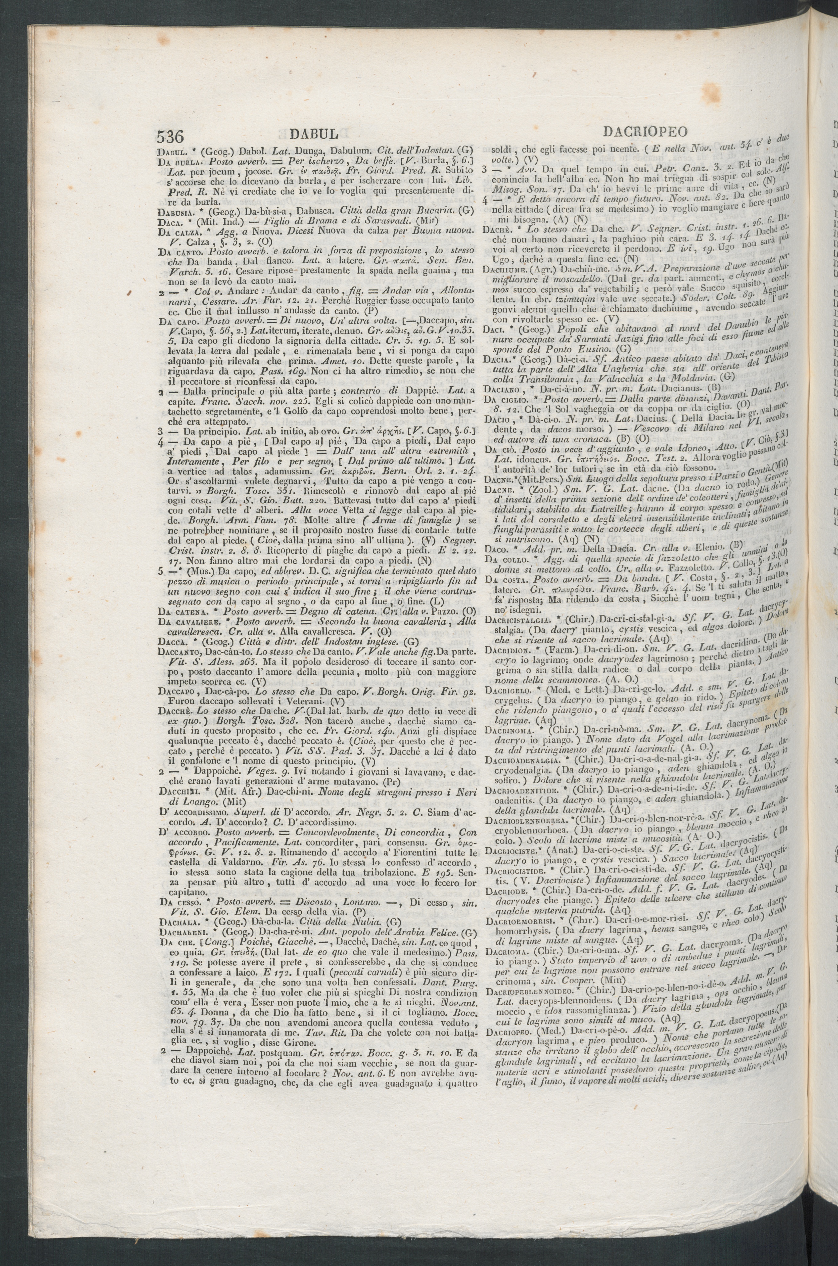 Dacci.. * (Gcog.) Dabol. Lat. Dunga, Dabulum. CU. dell'Indnslan. (G)Da CURIA. Posto avverò. s= Per isckerzo , Da beffe. (F. Burla, 6.)Lat. per jocum , jocosc. Gr. ìv irxtSix. Er. Giord. Pred. R. Subitos’ accorse che lo dicevano da burla, e per [scherzare con lui. Lib.Pred. /?. Nè vi crediate che io ve lo voglia qui presentemente di-re da burla.