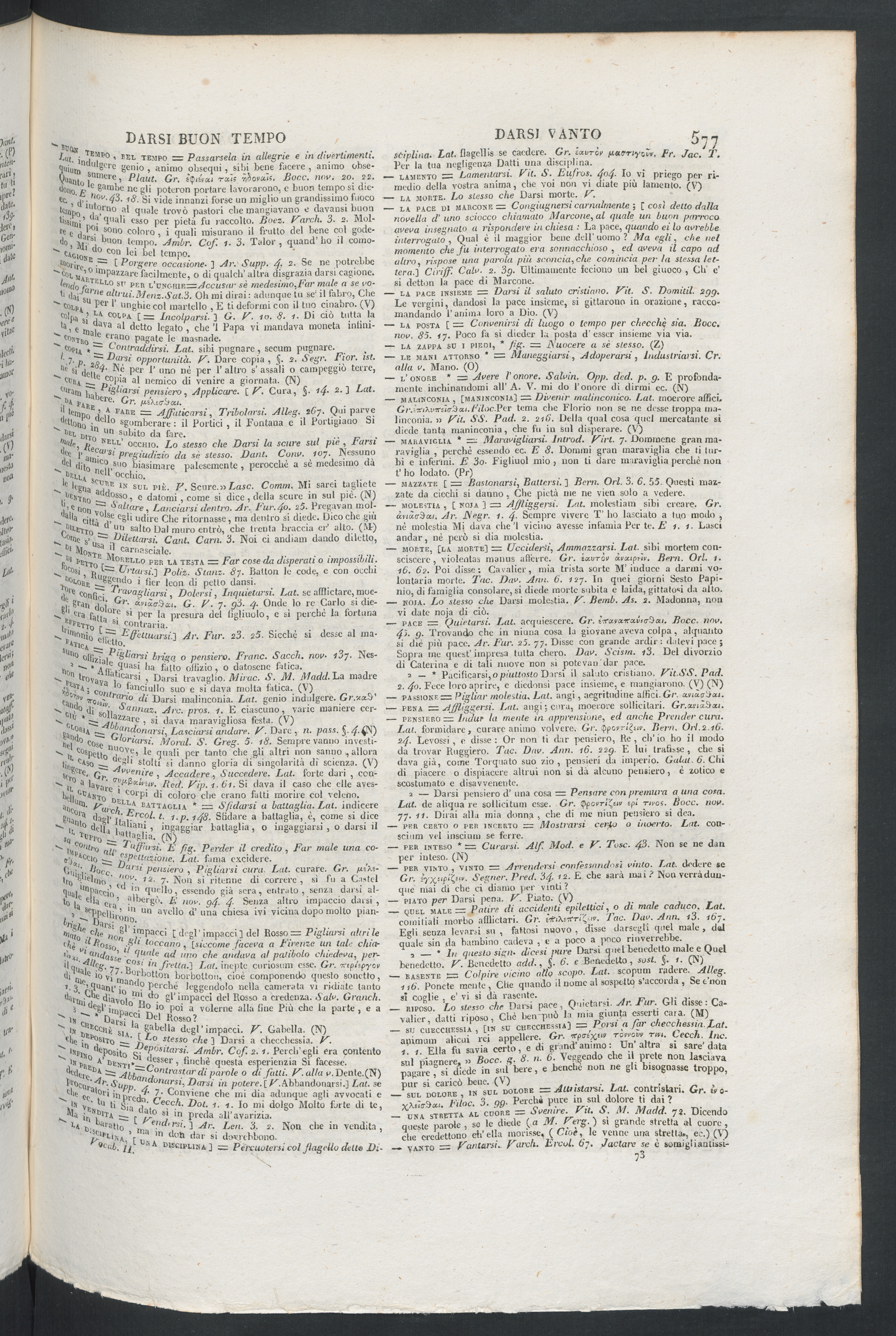 ti t|[I Caso ^ l'c ( stolti si danno gloria di singolarità di scienza. (V)s >To e " Or. „ n 'enire , Accadere , Succedere. Lai. forte duri , con-' it a bv;, r( . IC-cv-n;,.. p iei f yip, 1 . (i 1 . Si dava il caso che elle aves-hiliJ’hAiiTo DEi C ° r b' bi coloro che erano fatti morire col veleno.""tur 1 Ùnteli zr BATTAGL1A * = Sfidarsi a battaglia. Lai. indicere8'iam 3 'bigi' li'ip '". 6 ^' t- t.p.s48. Sfidare a battaglia, è, come si dice'■ U , d ell u j ‘7 la »* , ingaggiar battaglia, o ingaggiarsi , 0 darsi ilsa c Tl,p Fo a- ,! a f* la . (N)