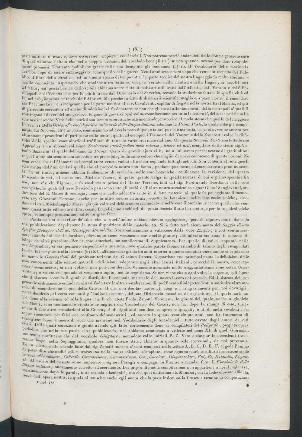Passiamo ora a favellar de’libri che a quell’indice abbiam dovuto aggiugnere, perchè sopravvenuti dopo laSUa pubblicazione. Seguiteremo la stessa disposizione delle materie. 12. Si è fatto testé alcun mollo del Saggio di uno^P°glio filologico dell’ab. Giuseppe Brambilla. Noi cominciammo a valercene dalla voce Empio , e cosi eontinuerc-1110 > citando lui che le fornisce , dovunque sieno veramente sue quelle giunte ; che talvolta era stato il comasco fi-lologo da altri preceduto. Per le cose anteriori, ne amplieremo il Supplemento. Per quelle di cui ci appuntò nellaf Ua appendice, ci sia permesso rispondere in una nota, ove qualche parola faremo eziandio di taluno degli esempi datiivi da lui per giunta alla derrata. (6) i 3 . Ci affaticavamo già da tre anni intorno a questa compilazione quando ci capitarono1,1 mano le Osservazioni del professor torinese sig. Giacinto Carena . Riguardano esse principalmente le definizioni delleCose concernenti alle scienze naturali : definizioni adoperale negli altri lessici italiani , perocché il nostro, come ap-P e na incominciato , ei non volle o non potè considerarlo. Veramente assennate molto e aggiustatissime sono cotali Osser-Vt 'zioni ; e volentieri, quando ci vengono a taglio, noi le seguitiamo. Se non viene citala ogni volta la sorgente, egli è per- 1c bò il sistema secondo il quale è distribuita 1 ’ economia materiale del nostro lavoro noi concede. Ed il sistema del suogenerale ordinamento escludeva altresì l’adottare le altre considerazioni di quell’acuto filologo tendenti a sostituire altro rne-1 odo di compilazione a quel della Crusca. 11 che non dee far tacere gli elogi e i ringraziamenti per noi dovutigli ,Dt: d desiderio , al certo con tutù gl’italiani comune, del suo Dizionario metodico di agricoltura, il quale sarà unl -l dono alla scienza ed alla lingua. 14. Il eh. abate Paolo Zanotti Veronese , le giunte del quale, anche a giudicio'Fd Monti, sono meritamente riputate le migliori del Vocabolario del Cesari, non ha, dopo la stampa di esso, trala-sciato di fare altre emendazioni alla Crusca, sì di significati non ben compresi e spiegati, e si di molti vocaboli cli’eiseppe riconoscer per falsi col confronto de’manoscritti ; ed ancora in questi venticinque anni non ha intermesso diAccogliere buon numero di voci che mancano nel Vocabolario degli Accademici , tutte cavate dagli autori da essiCUa| ì. Delle quali correzioni e giunte avendo egli fallo cortesemente dono ai compilatori dei Poligrafo , pregiata operaperiodica che nella sua patria si va pubblicando, noi abbiamo comincialo a vederle nel tomo XI. di quel Giornale ,n ° n a profittarne che dal vocabolo Ghignare , notandole colle iniziali P. Z. Vero è che pur le precedenti trove-ranno luogo nella Sopraggiunta, qualora non fossero state, almeno in quanto alle correzioni, da noi prevenute.
