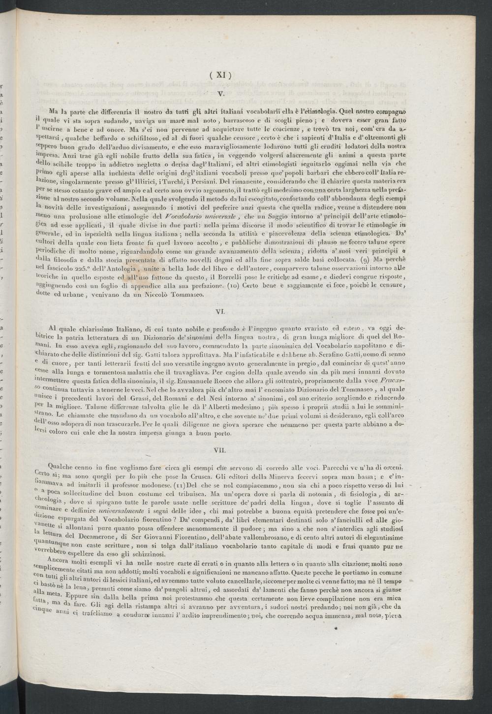 Ma la parte clic differenzia il nostro da tutti gli altri italiani vocabolari! ella è l’etimologia. Quel nostro compagno*1 «piale vi sta sopra sudando, naviga un mare mal nolo, burrascoso c di scogli pieno ; e doveva esser gran fatto1 uscirne a bene e ad onore. Ma s’ei non pervenne ad acquietare tutte le coscienze, e trovò tra noi, com’era da a-spellarsi , qualche beffardo o schifiltoso, ed al di fuori qualche censore , certo è che i sapienti d’Italia e d’oltremonti gliseppero buon grado dell’ arduo divisamento, e elle esso maravigliosamente lodarono tutti gli eruditi lodatori della nostraI,n Presa. Anzi trae già egli nobile frutto della sua fatica, in reggendo volgersi alacremente gli animi a questa partedello scibile troppo in addietro negletta o derisa dagl’italiani , ed altri etimologisti seguitarlo oggimai nella via cheI" 11110 egli aperse alla inchiesta delle origini degl’italiani vocaboli presso que’popoli barbari che ebbero coll’Italia re-ligione, singolarmente presso gl’ Illirici, i Turchi, i Persiani. Del rimanente, considerando che il chiarire questa materia eraP C1 ' se stesso cotanto grave ed ampio cal certo non ovvio argomento,il trattò egli medesimo con una certa larghezza nella prela-Z1 °ne al nostro secondo volume. Nella quale svolgendo il metodo da lui escogitalo,confortando coll’ abbondanza degli esempinovità delle investigazioni, assegnando i motivi del preferire anzi questa che quella radice, venne a distendere non•nono una prolusione alle etimologie del Vocabolario universale, clic un Saggio intorno a’principii dell’arte elimolo-S'ca ad esse applicali, il quale divise in due parli: nella prima discorse il modo scientifico di trovar le etimologie ingenerale, ed in ispeziclià nella lingua italiana; nella seconda la utilità e piacevolezza della scienza etimologica. Da’eultori della quale con lieta fronte fu quel lavoro accolto , e pubbliche dimostrazioni di plauso ne fecero talune opereperiodiche di molto nome, riguardandolo come un grande avanzamento della scienza, ridotta a’suoi veri principii afallii filosofia e dalla storia presentala di affatto novelli dogmi od alla line sopra salde basi collocata, (q) Ma perchè•tei lascicolo 22 Ò.° dell’Antologia , unite a bella lode del libro c dell’autore, comparvero talune osservazioni intorno alleboriche in quello esposte ed all’uso fittone da questo, il Corvelli poso le critiche ad esame, e diedevi congrue risposte,««gguignendo cosi un foglio di appendice olla sua prefazione, (io) Certo bene e saggiamente ei fece, poiché le censure,dotte ed urbane , venivano da un Niccolò Tommaseo .