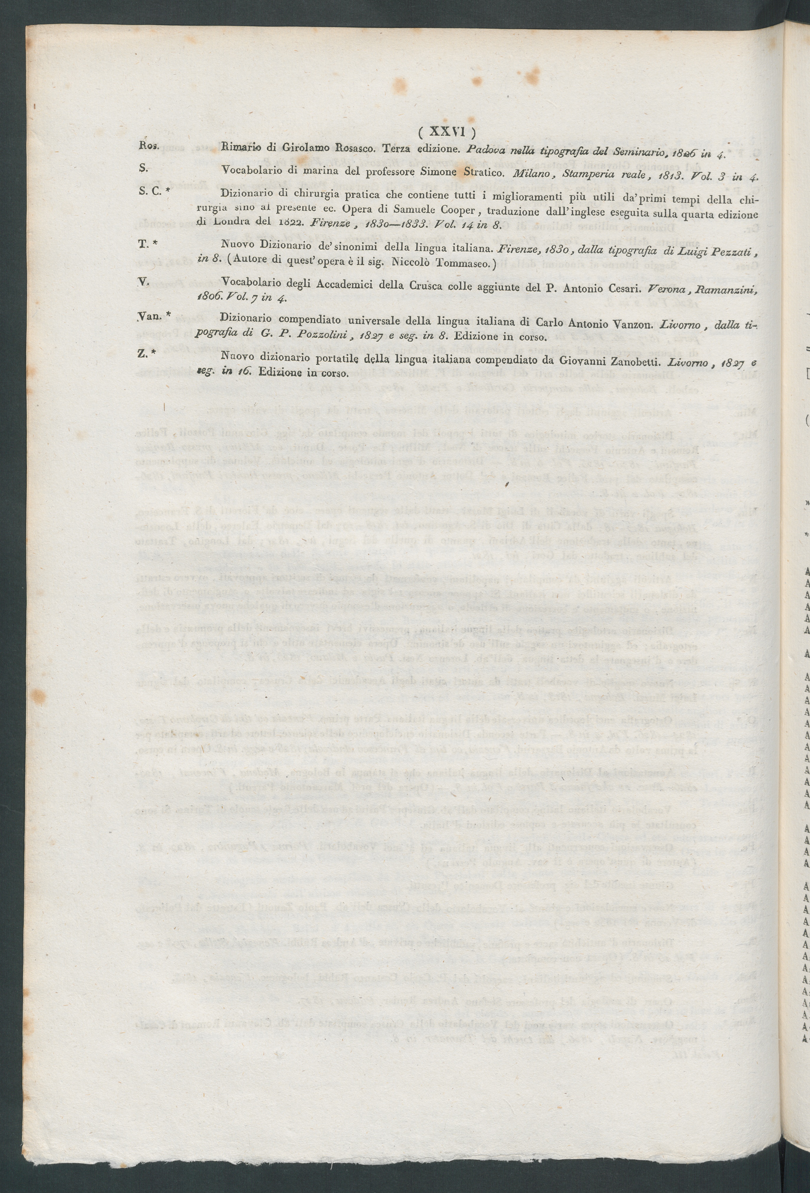 Dizionario compendiato universale della lingua italiana di Carlo Antonio Vanzon. Livorno , dalla ti-,pografia di G. P. Pozzolini, 1827 e seg. in 8. Edizione in corso.