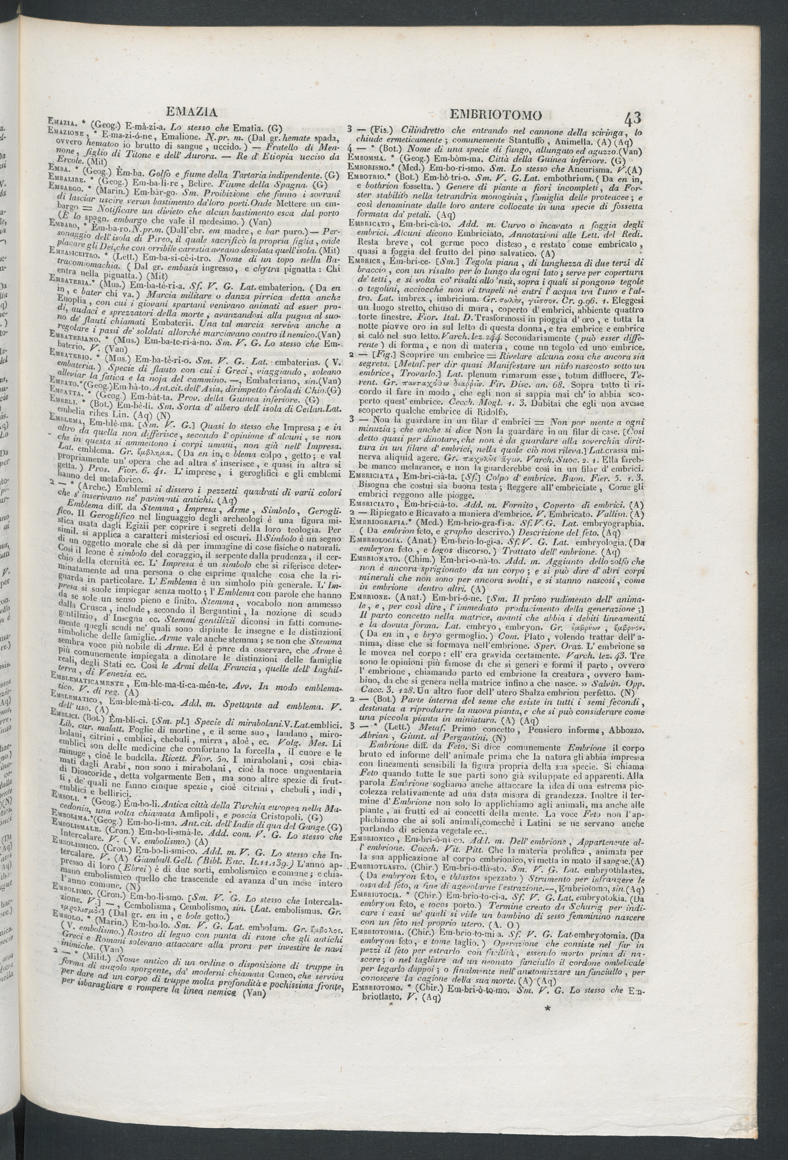 2 — Ripiegato e Ricavato a maniera d’embrice. F. Embricato. Fallisn. (A)Embriografia.* (Med.) Em-hrio-gra-fi-a. Sf.F.G. Lat. embryographia.