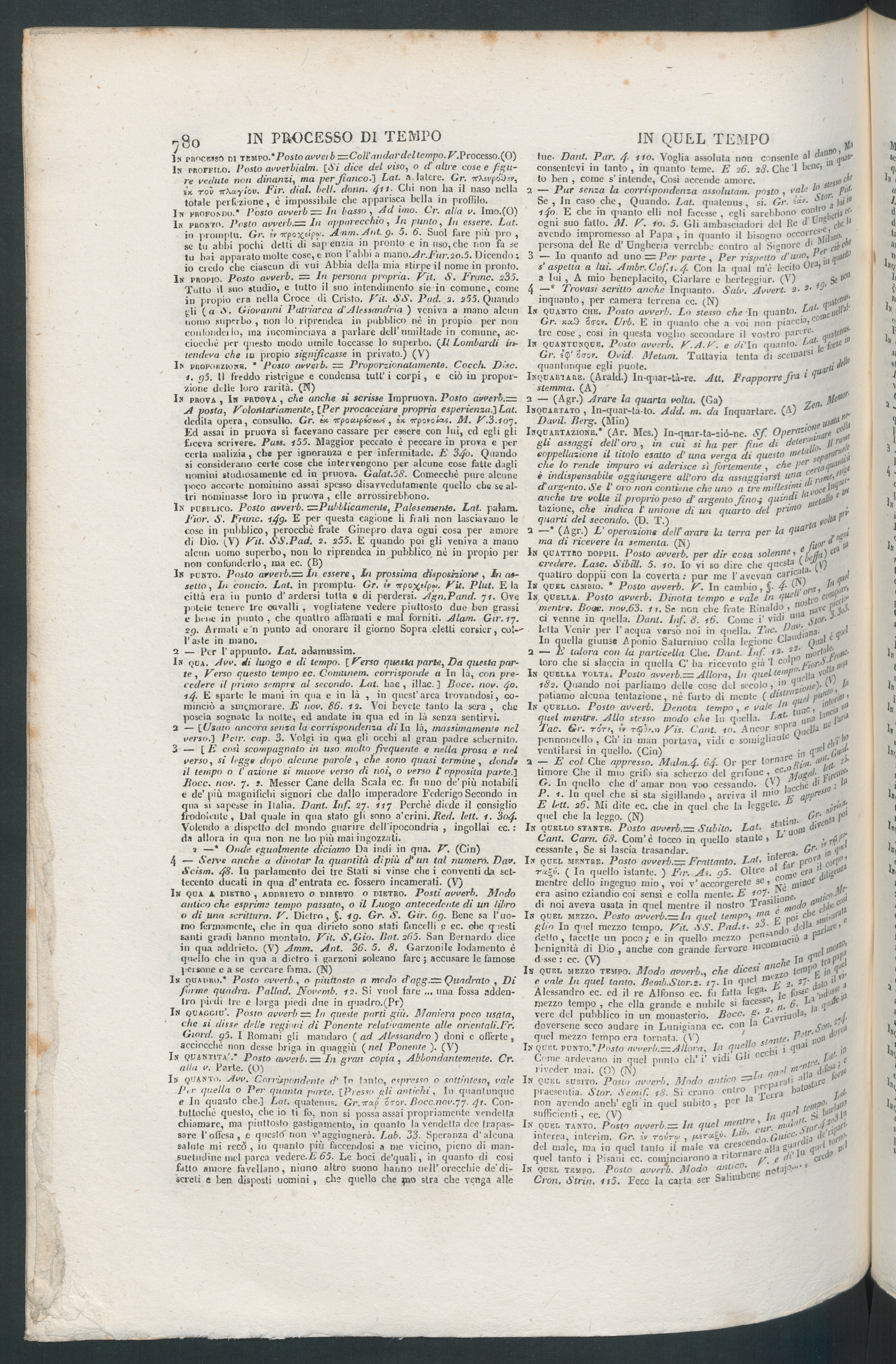 In QUELT.A. Posto avverb. Dinota tempo e vale In qW ^mentri. Boac. nov.63. 1t. Se non che frate Rinaldo n ° „a VLci venne in quella. Dant. Inf. 8. 16. Come i’ vidi 1111 $0-Iella Venir per l’acqua vsrsò noi in quella. Tue. , jj a ni>- ' ss-In quella giunse Aponio Saturnino colla legione Ciao Qual 02 — li talora con la particella Che. Dant. Iti fi 12 ’ ? 2 ' n) or t- 1 *,,#toro che si slaccia in quella C’ ha ricevuto già 'I c0 'v pior^f. ,]i).aIn Quelra volta. Posto avverb.— Allora, In quel temp 0, ^ vO , ‘Ì182. Quando noi parliamo delle cose del secolo, j n ^ l0 t' e )' ./ ^patiamo alcuna tentazione, nè furto di mente ( d‘ slr “ pi‘f