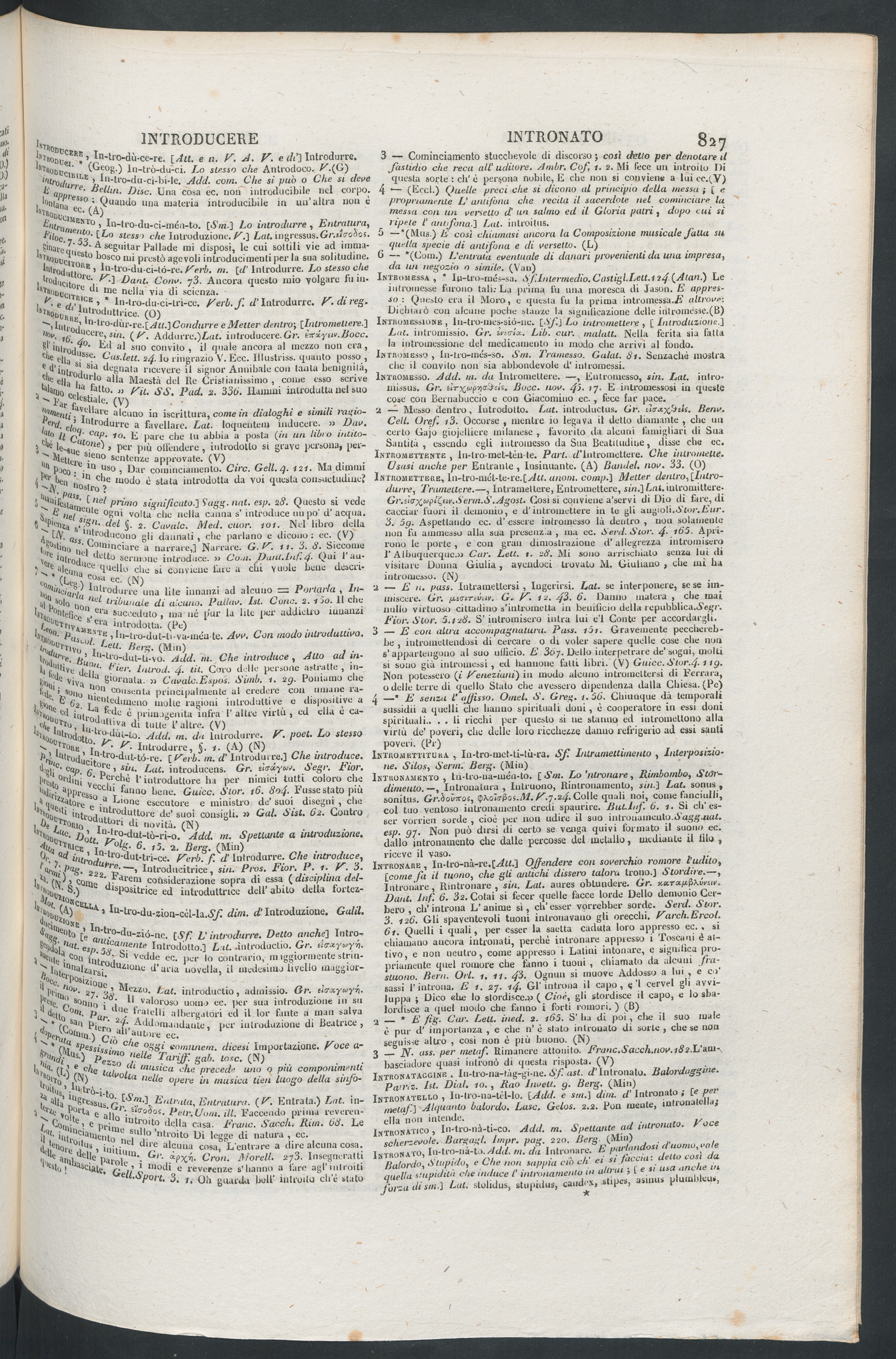 Intbouessa , * In-tro-més-sa. Sf.Intermedio. Castigl.Lelt.12<f {Alani) Leintromesse furono tali: La prima fu una moresca di Jason. E appres-so : Questo era il Moro, e questa fu la prima intromessa./? altrove:Dichiarò con alcune poche stanze la significazione delle ihtrome'sse.(B)iNTiioMEssiuME , lii-ti'o-iiics-sió-iie. [.Sf.] Lo intromettere , [ Introduzione.]Lat. intromissio. Gr. srftriss. Lib. cur. malati. Nella ferita sia fattala mtroinessione del medicamento in modo che arrivi al fondo.IwrnoMssso , lu-tro-ines-so. Sm. Promesso. Calai. 81. Scnzachà mostrache il convilo non sia abbondevole d’iniromessi.