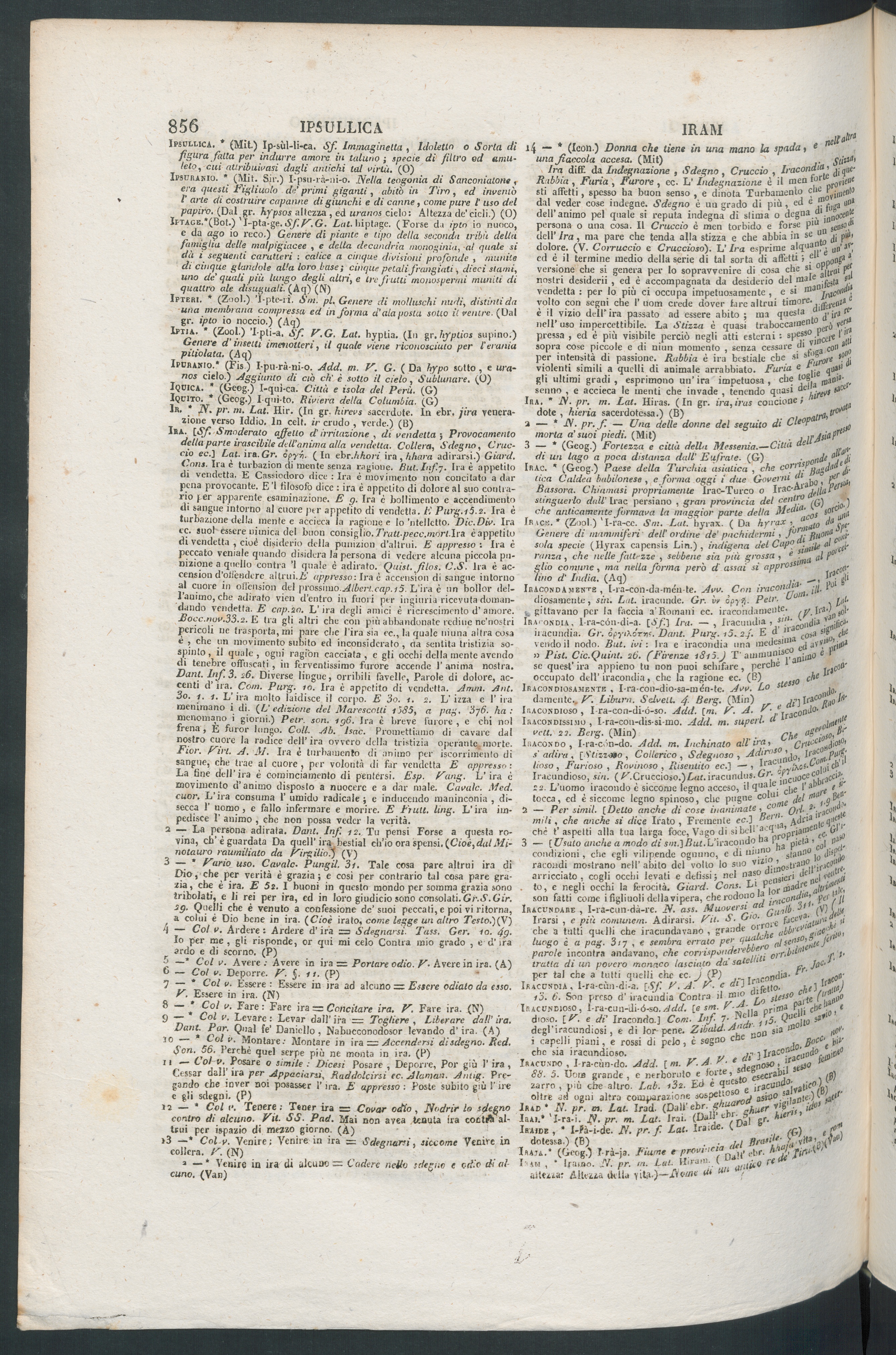 2 — La persona adirata. Dani. Inf. 12. Tu pensi Forse a questa ro-vina, eh’è guardata Da quell’ira bestiai ch’io ora spensi. {Cioè,dal Mi-notauro raumiliato da Firgiliofy (V)
