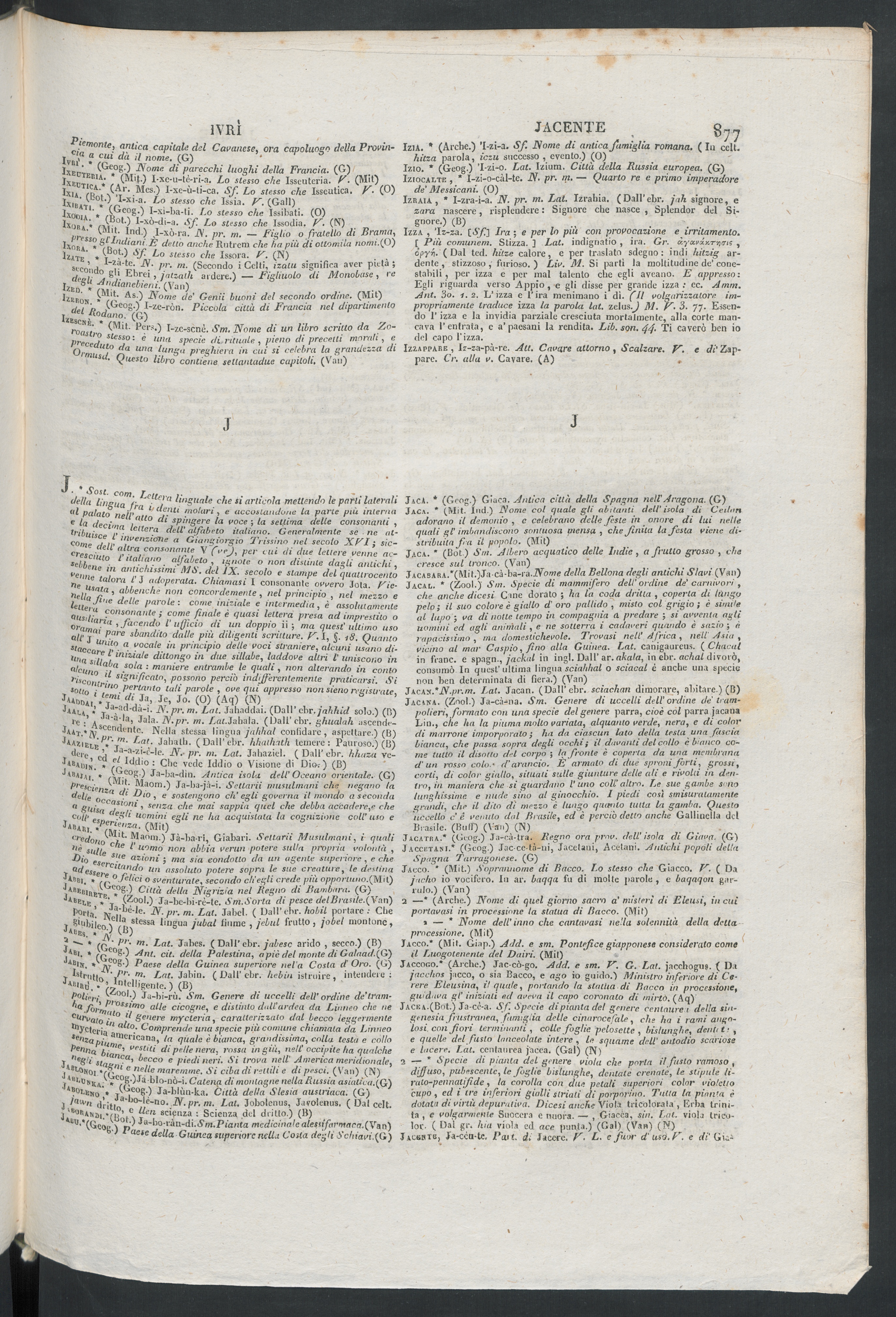 Jacatra.* (Geog.) Ja-cà-tra. Begno ora pmv. dell'isola di Giova. (G)Jaccetasi.* (Geog.) Jac-ce-tà-ni, Jacetaui, Aeétani. Antichi popoli deliaSpagna Tarragonese. (G)