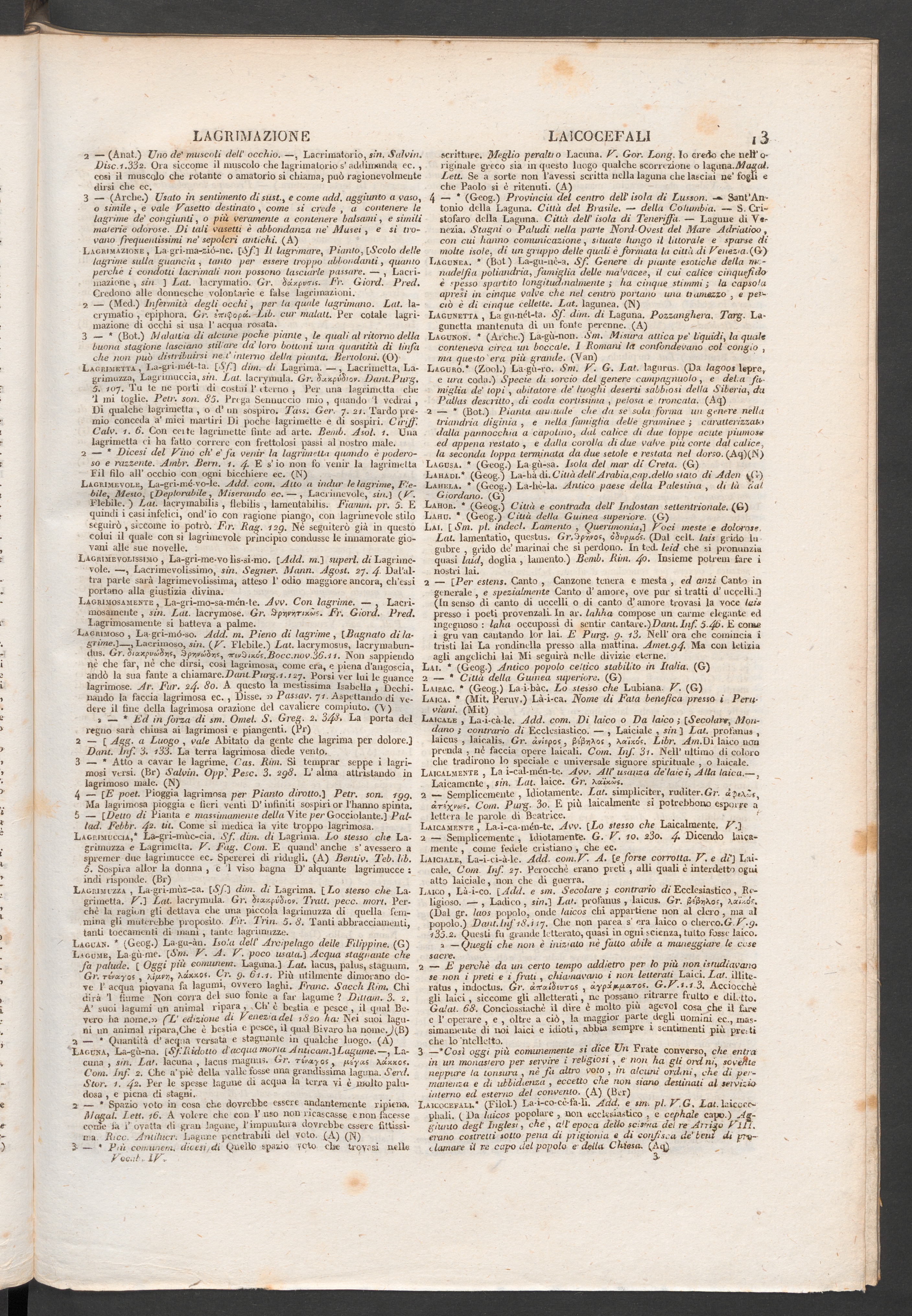 2 — * Quantità d’ acqua versata e stagliante in qualche luogo. (A)Laguna, La-gù-na. [Sf.Ridotto d’acqua morta Anticam.)Lagume.—, La-cuna , sin. Lai. lacuna , lacus magniti, tir, rinxyos, pi-pus hxxxos.Com. Inf. 2. Che a’piè della valle fosse una grandissima laguna. Seni.Star. 1. 4 2 - Per le spesse lagune di acqua la terra vi è molto palu-dosa , e piena di stagni.