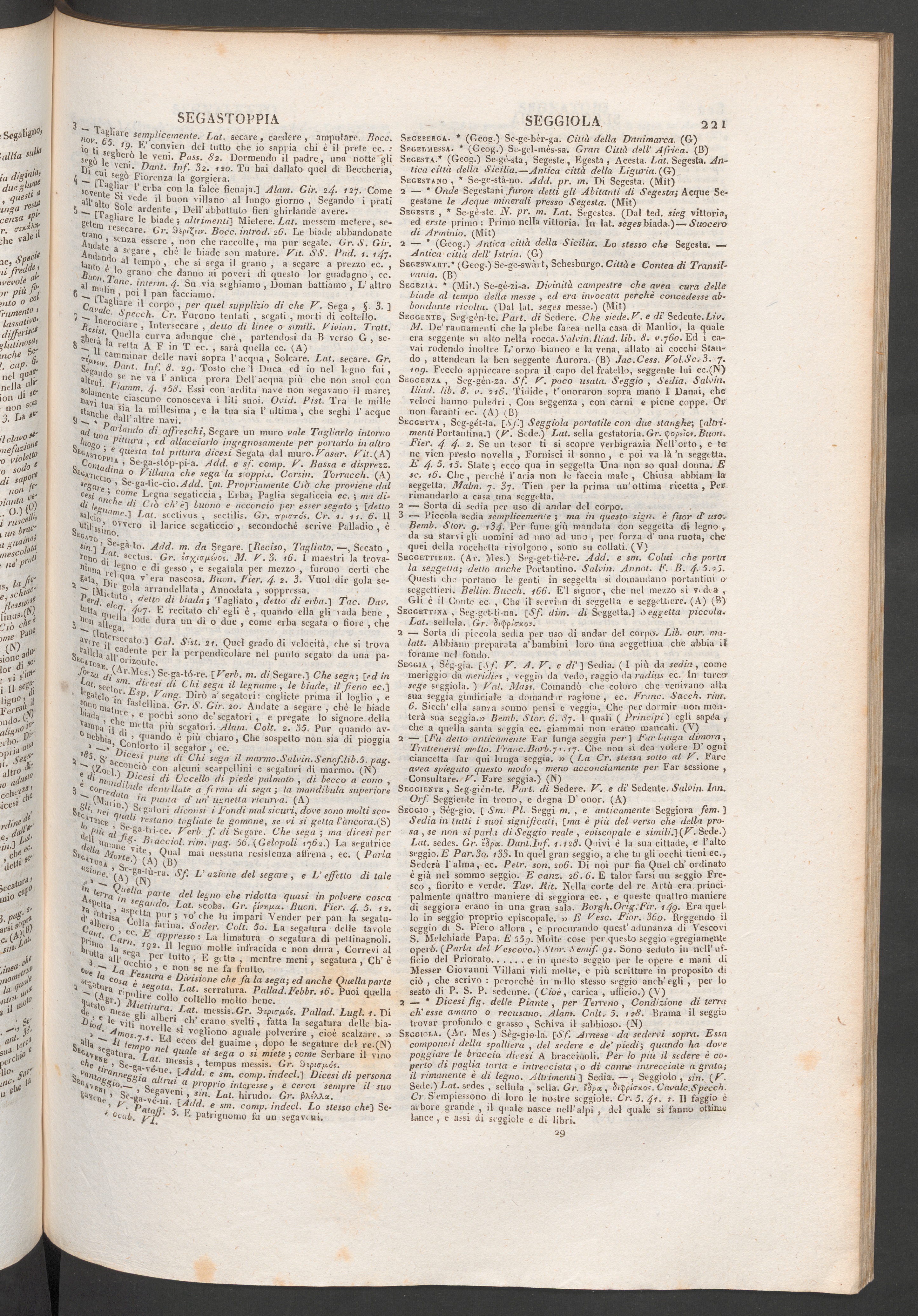 Seggia , Sèg-gia. [.Sf. V. A. V~. e di'] Sedia . (I più da sedia, coniomeriggio da meridies , veggio da vedo, raggio da radius ec. In torcersege siggiola. ) Tal. Mass. Comandò che coloro che venivano allasua seggio gìiuUciale a domandar ragione, ec. Brune. Sacch. rim.6. Siedi'ella sunza sonno pensi e veggia, Che per dormir non mon-terà sua seggia.» Bemb. Stor. 6. 8y. I quali ( Principi) egli sapèa ,•che a quella santa saggia ec. giammai non erano mancati. (V)