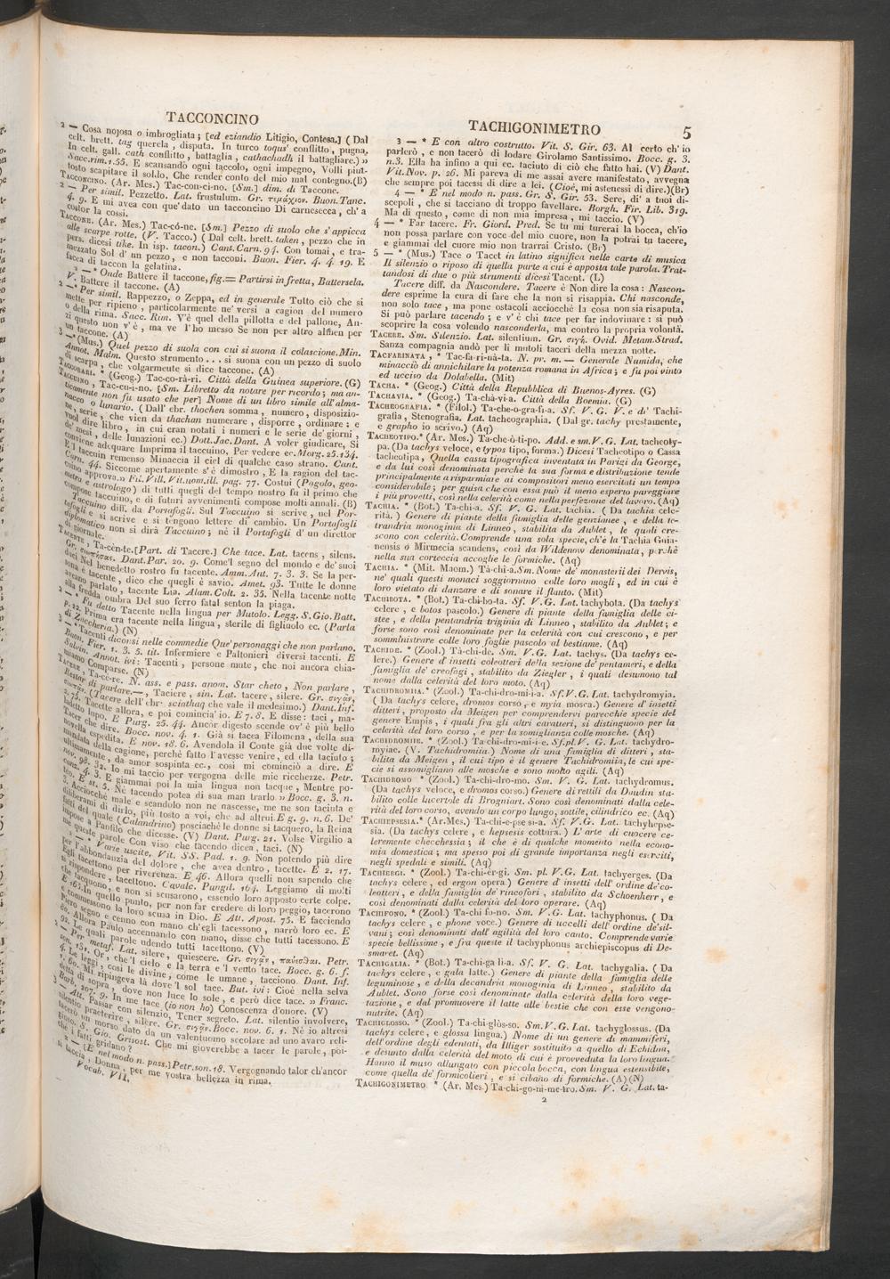 Tàcheotipq.* (Ar. Mes.) Ta-cbe ò-ti-po. Add. e sm.K.G. Lai. tacbeoty-pa. (Da tachys veloce, e typos tipo, forma.) Dicesi Tacheotipo o Cassataclicotipa, Quella cassa tipografica inventata in Parigi da George,e da lui così denominala perchè la sua forma e distribuzione tendeprincipalmente a risparmiai e ai compositori meno esercitali un tempoconsiderabile ; per guisa che con essa può il meno esperto pareggiarei più provetti , così nella celerità come nella perfezione del lavoro. (Aq)Taciua. * (Dot.) Ta-chì-a. Sf. K. G. Lat . tachia. ( Da tachia cele-rità. ) Genere di piante della famiglia delle genzianee , e della tc-Irandria monogitua di Linneo , stabilita da Aublet , le quali cre-scono con celeri là. Comprende una sola specie, eli è la Tachia Gma-nensis 0 Mirmecia scanciens, così da Wildenow denominata , p rchenella sua corteccia accoglie le formiche. (Aq)