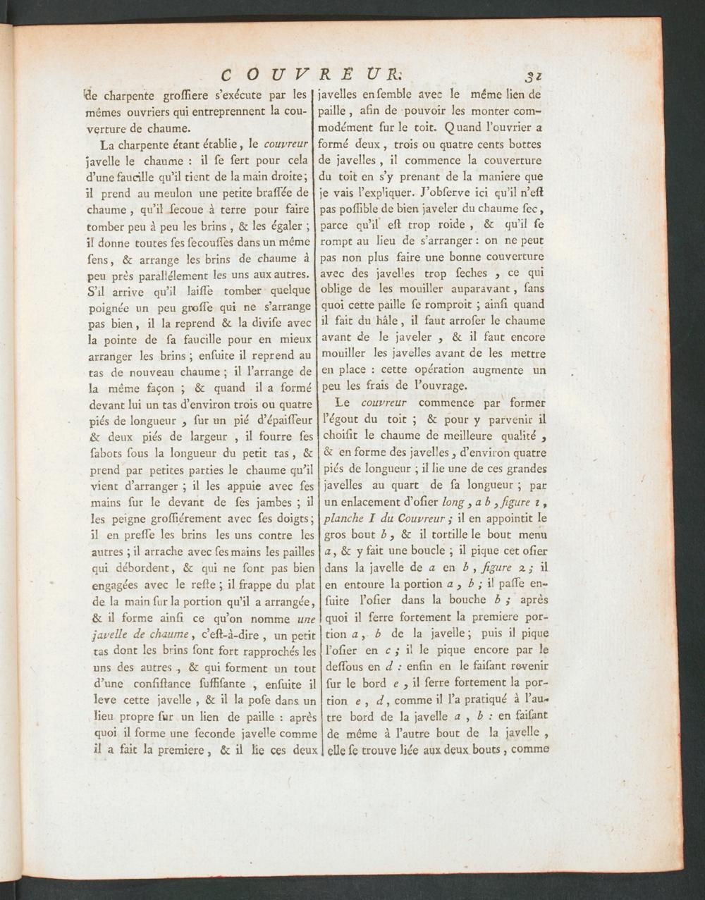 Le couvreur commence par formerl’égout du toit ; & pour y parvenir ilchoisit le chaume de meilleure qualité ,& en forme des javelles, d’environ quatrepiés de longueur ; il lie une de ces grandesjavelles au quart de fa longueur ; parun enlacement d’osier long , a b , figure t ,planche I du Couvreur , il en appointât legros bout b y & il tortille le bout menua , & y fait une boucle ; il pique cet osierdans la javelle de a en b , figure z ilen entoure la portion a , b ; il passe en-suite l’osier dans la bouche b aprèsquoi il ferre fortement la premiere por-tion a, b de la javelle ; puis il piquel’osier en c ,• il le pique encore par ledessous en d : enfin en le faisant revenirsur le bord e , il serre fortement la por-tion e , d, comme il l’a pratiqué à l’au-*tre bord de la javelle a , b ; en faisantde même à l’autre bout de la javelle ,elle se trouve liée aux deux bouts, comme