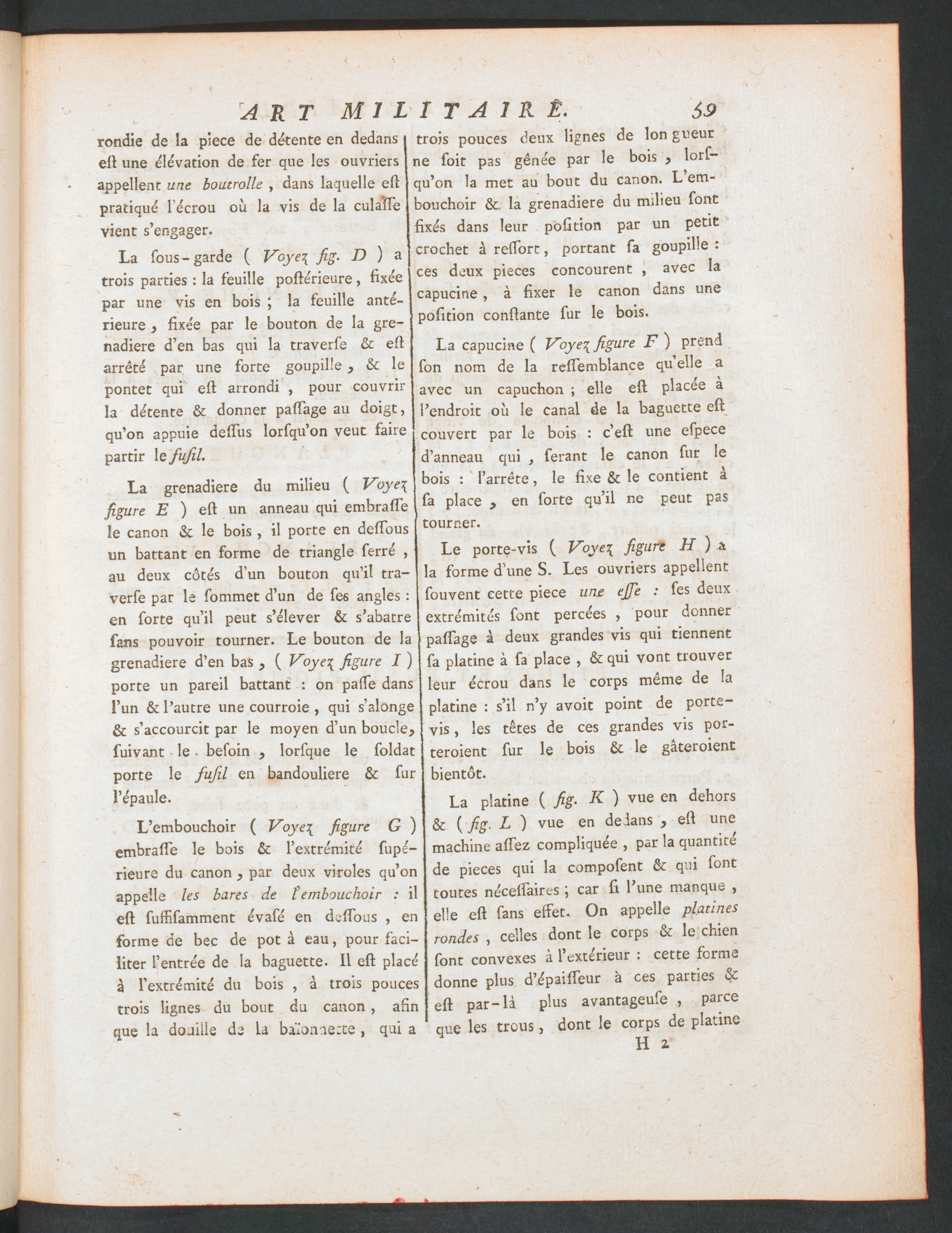 La grenadiers du milieu ( Voye\figure E ) est un anneau qui embrassele canon & le bois , il porte en dessousun battant en forme de triangle ferré ,au deux côtés d’un bouton qu’i! tra-verse par le sommet d’un de ses angles :en forte qu’il peut s’élever & s’abatrefans pouvoir tourner. Le bouton de lagrenadiers d’en bas , ( Voye% figure I )porte un pareil battant : on passe dansl’un & l’autre une courroie , qui s’alonge& Raccourcit par le moyen d’un boucle,suivant le • besoin , lorsque le soldatporte le fusil en bandoulière & surl’épaule.