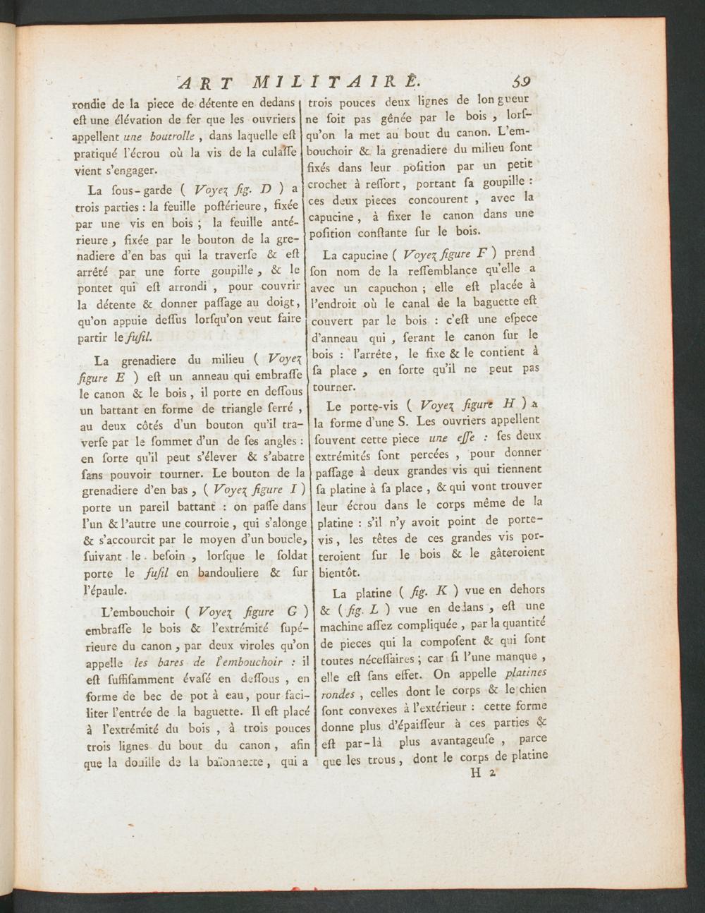 L’embouchoir ( Voye\ figure G )embrasse le bois & l’extrémité supé-rieure du canon , par deux viroles qu’onappelle les bares de îembauchoir : ilest suffisamment évasé en dessous , enforme de bec de pot à eau, pour faci-liter l’entrée de la baguette. II est placéà l’extrémité du bois , à trois poucestrois lignes du bout du canon, afinque la douille de la baïonnette , qui a