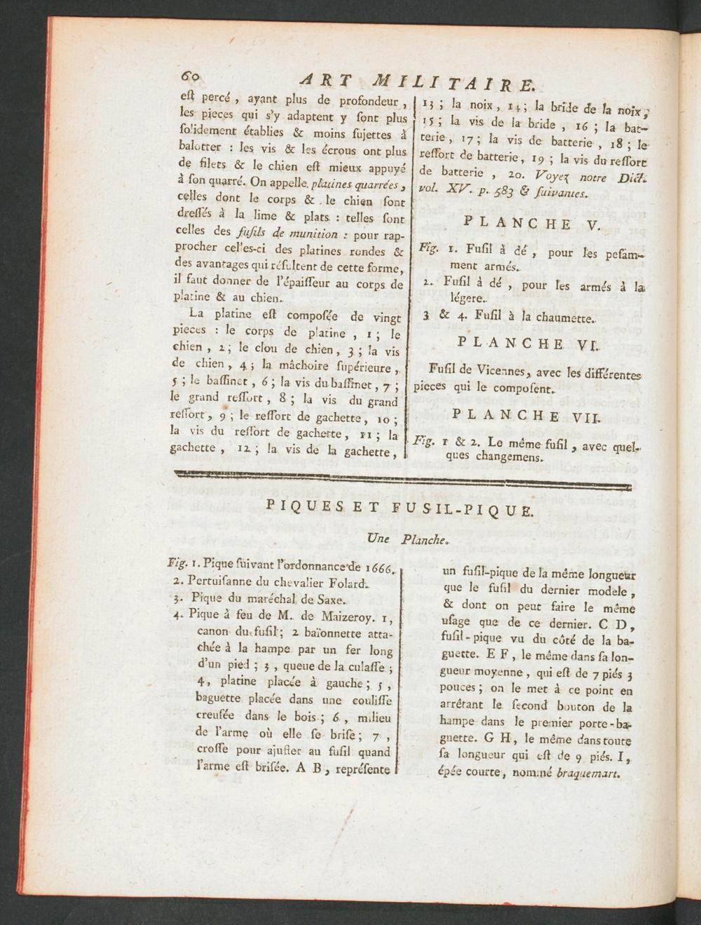 Fig. 1. Pique suivant l’ordonnance'dé 1 666.2. Pertuifanne du chevalier Folard-5. Pique du maréchal, de Saxe-4- Pique à feu de M- de Maizeroy. 1,canon chu fusil ; 2 baïonnette atta-chée à la hampe par un fer longd’un pied ; ; , queue de la culasse ;4, platine placée à gauche ; j ,baguette placée dans une coulissecreusée dans le bois ; 6 , milieude l’arme où elle fe brisé ', 7 ,crosse pour ajuster au fusil quandParme est brisée. A 8, représente