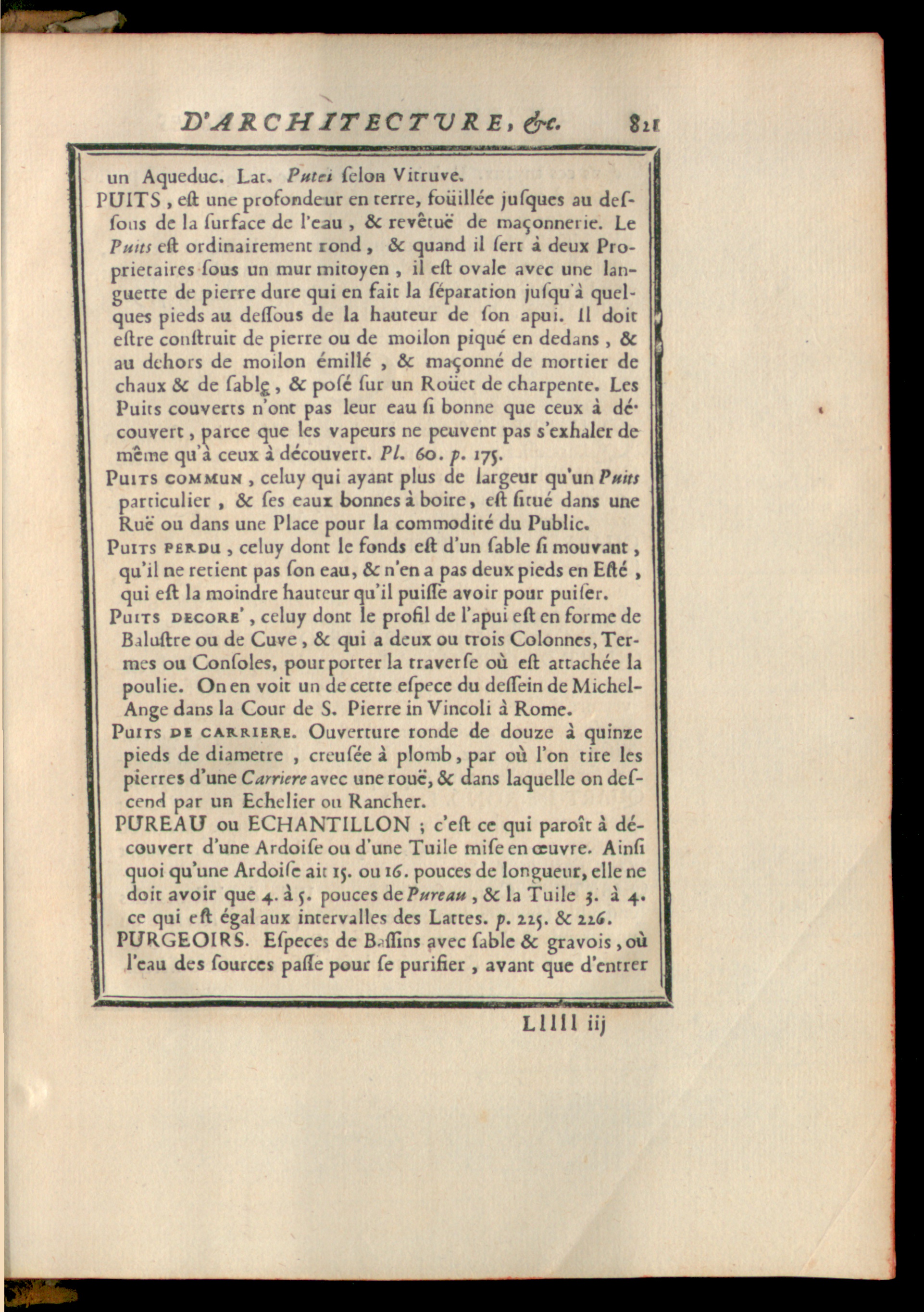 5 UITS , est une profondeur en terre, fouillée jusques au des-sous de la surface de l’cau , Sc revêtue de maçonnerie. LePuits est ordinairement rond , Sc quand il sert à deux Pro-priétaires fous un mur mitoyen , il est ovale avec une lan-guette de pierre dure qui en fait la séparation jusqu à quel-ques pieds au dessous de la hauteur de son apui. il doitestre construit de pierre ou de moilon pique en dedans, Scau dehors de moilon émillé , Sc maçonné de mortier dechaux Sc de fablg, & pose fur un Rouet de charpente. LesPuits couverts n’ont pas leur eau Ci bonne que ceux à dé*couvert, jaarce que les vapeurs ne peuvent pas s'exhaler demême qu a ceux à découvert. PI. 60. p. 175.