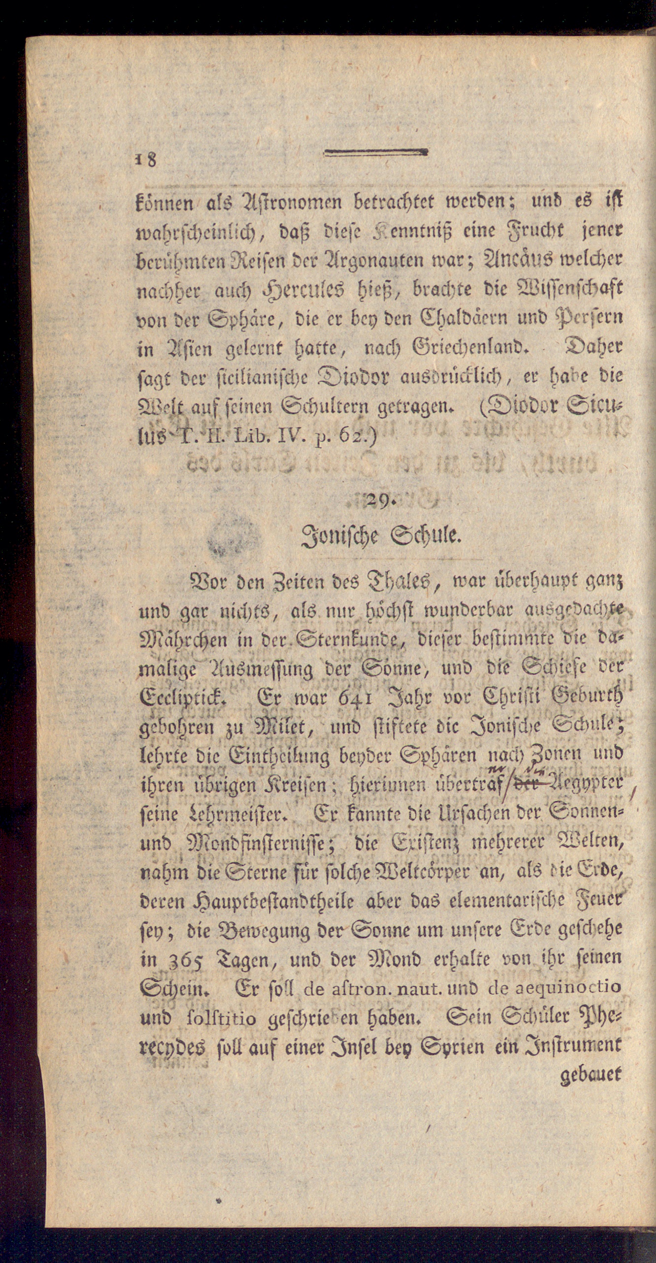 Vor den Zeiten des N-ales, war überhaupt ganzund gar nichts, als nur höchst wunderbar ausgedachteMahrchcn in der.Sternkunde, dieser bestimmte die des-maligc Ausmessung der Sönne, und dir Schiefe derEccliptiek. Er war 641 Jahr vor Christi Geburth'gebohren zu Milct, und stiftete die Ionische Schule;lehrte die Einthcilung beyder Sphären nachfeilen undihren übrigen Kreisen; hieriunen übcrtraf/d^s--Aegypter ^seine Lehrincistcr. Er kannte die Ursachen der Sonnen- ■und Mondfinsternisse; die Existenz mehrerer Welten,uähm die Sterne für solche Weltcörper an, als die Erde,deren Hauptbcstandtheilc aber das elementarische Feuer'sey; die Bewegung der Sonne um unsere Erde gesckehein 36; Tagen, und der Mond erhalte von ihr seinenSchein. Er soll cke astro n. naut. und cie aequinoctiound solstitio geschrieben haben. Sein Schüler Phe-recydes soll auf einer Insel bey Syrien ein Instrument