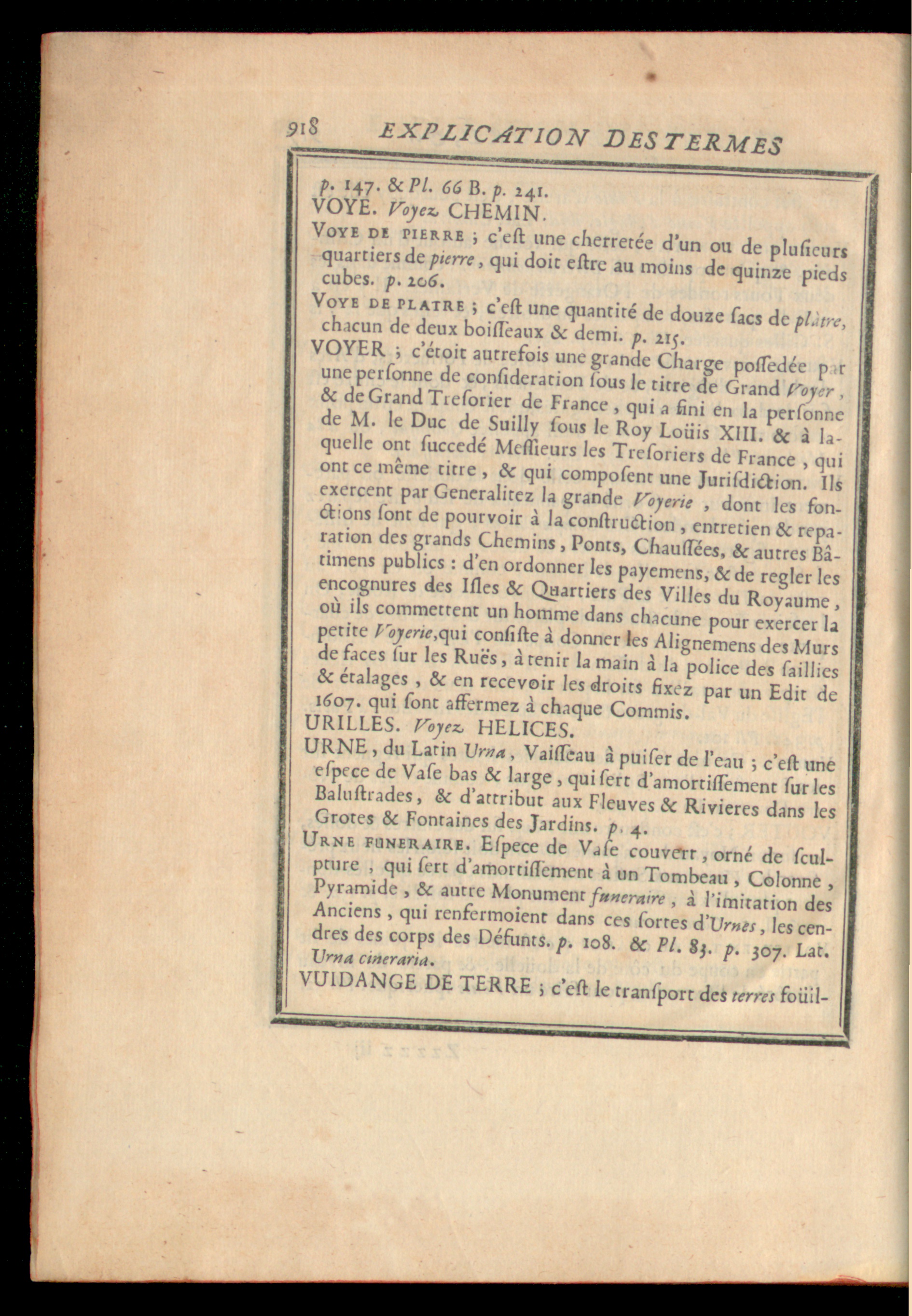 VOYER ; c’étoit autrefois une grande Charge possédée p,rune personne de considération lous le titre de Grand Foyer ,& de Grand Tiesorier de France , qui a fini en la personnede M. le Duc de Suilly fous le Roy Louis XIII. & à la-quelle ont succédé Messieurs les Trésoriers de France , quiont ce même titre , Sc qui composent une Jurisdiction. Ilsexercent par Generalitez la grande Fojerie , dont les fon-ctions font de pourvoir à la construction , entretien Sc répa-ration des grands Chemins, Ponts, Chaussées, & autres Bâ-timens publics : d’en ordonner les payemens, & de regler lesencognures des Isles 8c Quartiers des Villes du Royaume,où ils commettent un homme dans chacune pour exercer lapetite Voyerie ,qui consiste à donner les Alignemens des Mursde faces fur les Rues, à tenir la main à la police des failliesSc étalages , Sc en recevoir les droits fixez par un Edit de1607. qui font affermez à chaque Commis.