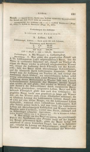 r Darstellung. 1. Mao glüht den gepulverten Pelaiil mit4- Th. kohlensaurem (oder salpetersaurem) Baryt, löst dieMasse in verdünnter Salzsäure auf, dampft zur Trockne ab,nimmt die Masse wieder in schwach sal/.gesäuertem Wasserauf, trennt die Auflösung durch Filtration von der Kiesel-erde, fallt den Baryt durch überschüssige Schwefelsäure,und die Alaunerde durch kohlensaures Ammoniak. Hieraufdampft man die Auflösung zur Trockne ab, und verjagt dasAmmoniak durch Glühen, wo schwefelsaures Lithon nebstwenig schwefelsaurem Kalk (und Mangan) bleibt. Aus derAuflösung .dieses Rückstandes in Wasser fallt man ( durchhydrothionsaures Ammoniak das Mangan; hierauf dampftman wieder ab und glüht, löst'wieder in Wasser auf undfällt darauf]) die Schwefelsäure durch essigsauren Baryt.Die davon geschiedene, essigsaures Lithon, Baryt und Kalkhaltende Flüssigkeit glüht man nach dem Abdampfen; diegeglühte Masse kocht man gepulvert so lange mit Wasseraus, als das Wasser noch etwas Alkalisches aufnimmt; dieso erhaltene Lösung des kohlensauren Lithons dampft manab (bis auf eine kleine Menge, wo das kohlensaure Lithonniederfällt, während etwa vorhandenes kohlensaures Kalioder Natron gelöst bleibt), und man kocht das kohlensaureLithon mit überschüssigem Kalkhydrat und Wasser mehrereStunden unter Uinnihreii, worauf man filtrirt, abdampft undim Silbertiegel schmelzt. Aiu'vkuson. Die iu Klammern befind-lichen Zusätze rühren von C. G. Gmki.ix her.