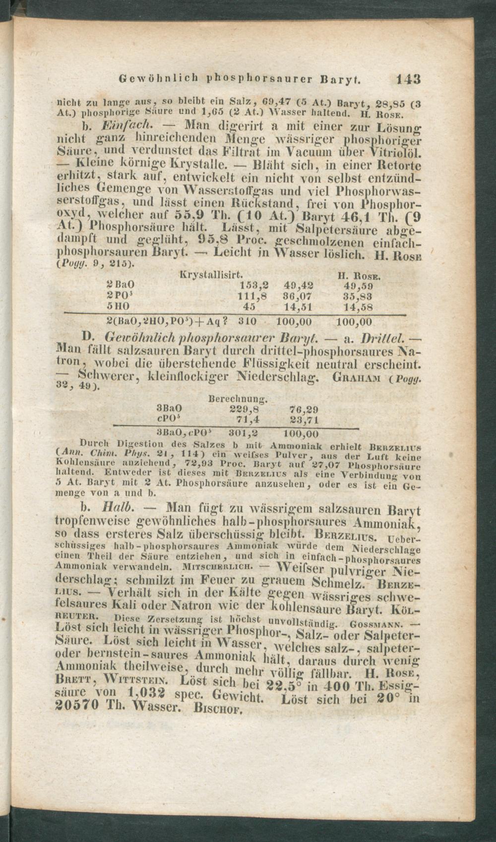 nicht zu lange aus, so bleibt ein Salz, C9,47 {5 At.) Baryt, 28,85 (3At.) phospliorige Siiure und 1,05 (2 At.) Wasser haltend. II. Rosk.