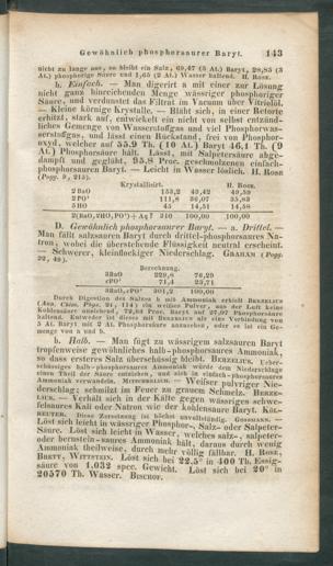 Durch Digestion des Salzes b mit Amniouiak erhielt IlEUZRi.it's(Ami. Chitn. l‘hys. 21, 114) ein weifses Pulver, aus der Luft keineKohlensäure anziehend, 72,03 Proc. Baryt auf 27,07 Pliospltorsüurchaltend. Entweder ist dieses mit Bhkzki.ics als eine Verbindung von5 At. Baryt mit 2 At. Phosphorsäurc anzusehen, oder es ist ein Ge-menge von a und b.