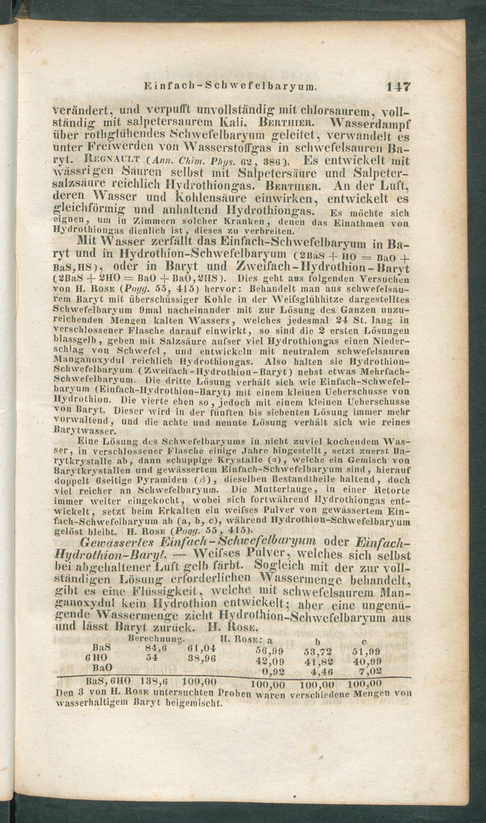 Mit Wasser zerfällt das Einfach-Schwefelbaryum in Ba-ryt und in Ilydrothion-Schwefelbaryum c2iia.s + ho = nao +BaS,HS), oder in Baryt und Zweifach -Hydrothion- Baryt(2I)aS -f ail() = BaO H- Bat), 21IS ). Uirs geht aas folgenden Versuchenvon tl. Hose ( Pot/t/. 55, 415) hervor: Behandelt man aus schwefelsau-rem Baryt mit überschüssiger Kohle in der Weifsglühhitze dargestelltesSchwefelbaryuni Omni nacheinander mit zur Lösung des Ganzen unzu-reichenden Mengen kalten Wassers, welches jedesmal 24 St. lang inverschlossener Flasche darauf einwirkt, so sind die 2 ersten Lösungenblassgelb , geben mit Salzsäure aufscr viel Hydrothiongas einen Nieder-schlag von Schwefel, und entwickeln mit neutralem schwefelsaurenManganoxydul reichlich Hydrothiongas. Also halten sic Ilydrothion-Schwefelbaryum ( Zweifach"- Hydrothion - Baryt) nebst etwas Mehrfach-Schwefelbaryum. Die dritte Lösung verhält sich wie Einfach-Schwefel-barviim (Eiufach-Hvdrothion-Baryt) mit einem kleinen Ueberschusse vonHydrothion. Die vierte eben so, jedoch mit einem kleiuen Ueberschussevon Baryt. Dieser wird in der fünften bis siebenten Lösung immer mehrvorwaltend, und die achte und neunte Lösung verhält sich wie reinesBarytwasscr.