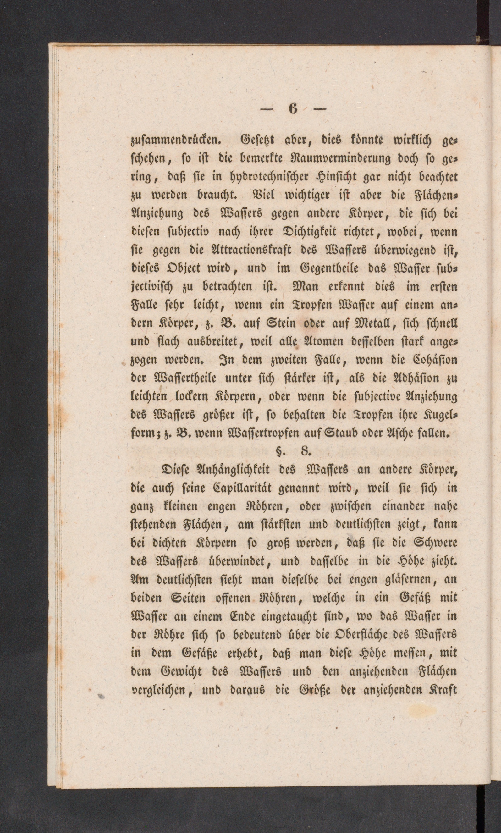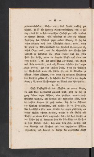 Diese Anhänglichkeit des Wassers an andere Körper,die auch seine Capillarität genannt wird, weil sie sich inganz kleinen engen Röhren, oder zwischen einander nahestehenden Flächen, am stärksten und deutlichsten zeigt, kannbei dichten Körpern so groß werden, daß sie die Schweredes Wassers überwindet, und dasselbe in die Höhe zieht.Am deutlichsten sieht man dieselbe bei engen gläsernen, anbeiden Seiten offenen Röhren, welche in ein Gefäß mitWasser an einem Ende eingetaucht sind, wo das Wasser inder Röhre sich so bedeutend über die Oberfläche des Wassersin dem Gefäße erhebt, daß man diese Höhe messen, mitdem Gewicht des Wassers und den anziehenden Flächenvergleichen, und daraus die Größe der anziehenden Kraft