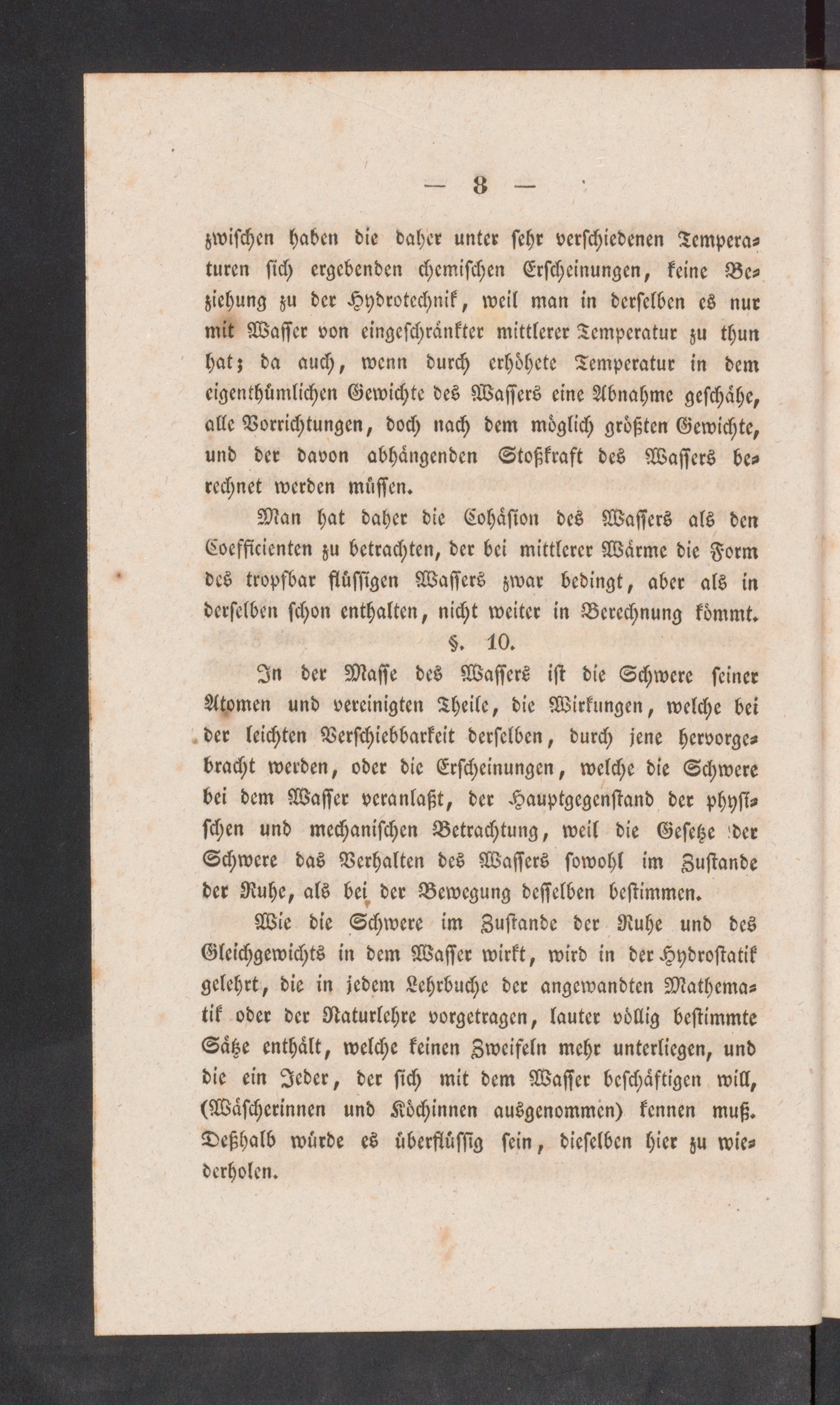 In der Masse des Wassers ist die Schwere seinerAtomen und vereinigten Theile, die Wirkungen, welche beider leichten Verschiebbarkeit derselben, durch jene hervorge-bracht werden, oder die Erscheinungen, welche die Schwerebei dem Wasser veranlaßt, der Hauptgegcnstand der physi-schen und mechanischen Betrachtung, weil die Gesetze 'derSchwere das Verhalten des Wassers sowohl im Zustandeder Ruhe, als bei, der Bewegung desselben bestimmen.