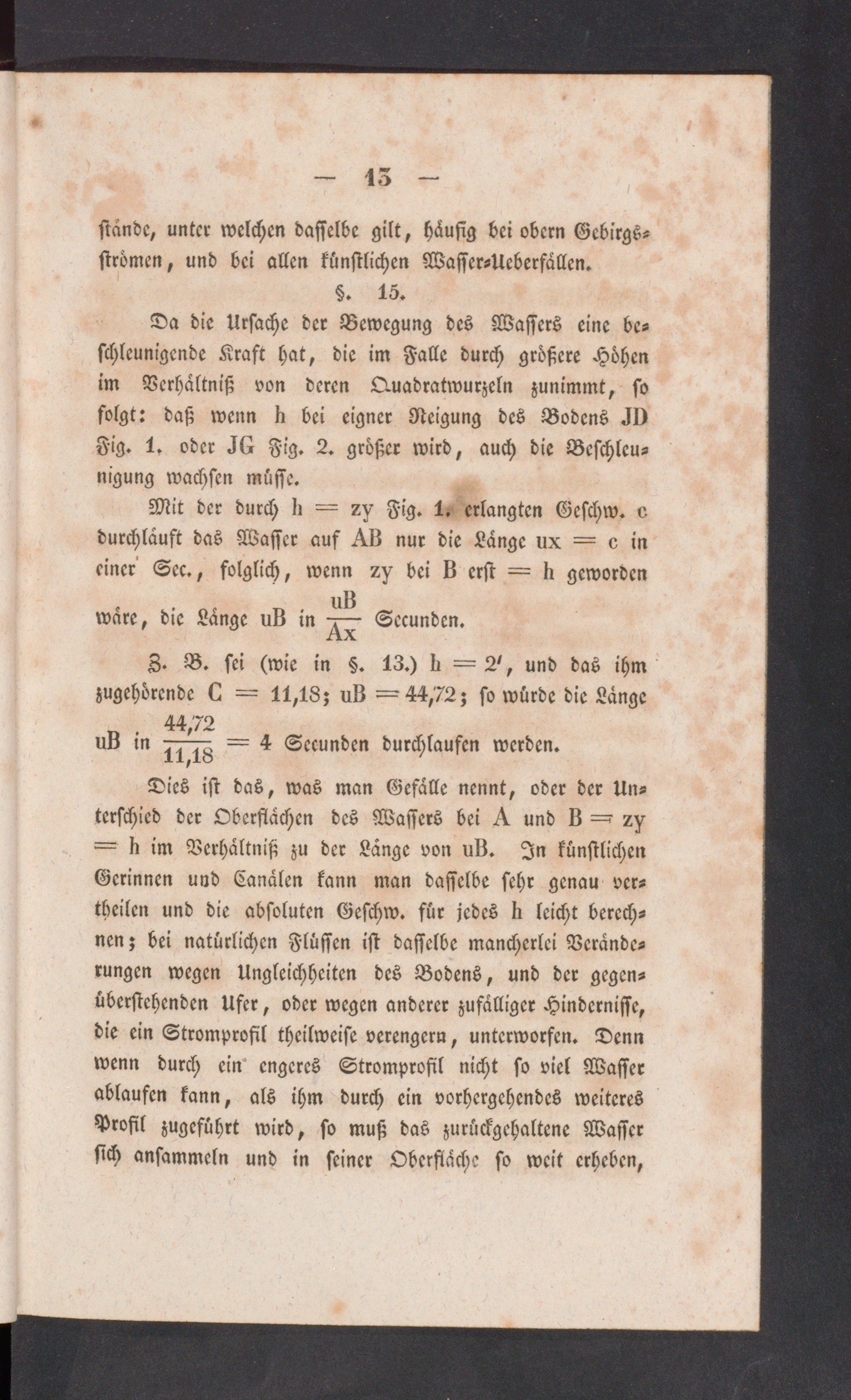 Dies ist das, was man Eefälle nennt, oder der Un-terschied der Oberflächen des Wassers bei A unb B =? zy— st im Verhältniß zu der Länge von uB. In künstlichenGerinnen und Canälen kann man dasselbe sehr genau ver-theilen und die absoluten Geschw. für jedes st leicht berech-nen; bei natürlichen Flüssen ist dasselbe mancherlei Verände-rungen wegen Ungleichheiten des Bodens, und der gegen-überstehenden Ufer, oder wegen anderer zufälliger Hindernisse,die ein Stromprofil theilweise verengern, unterworfen. Dennwenn durch ein engeres Stromprofil nicht so viel Wasserablaufen kann, als ihm durch ein vorhergehendes weiteresProfil zugeführt wird, so muß das zurückgehaltene Wassersich ansammeln und in seiner Oberfläche so weit erheben,