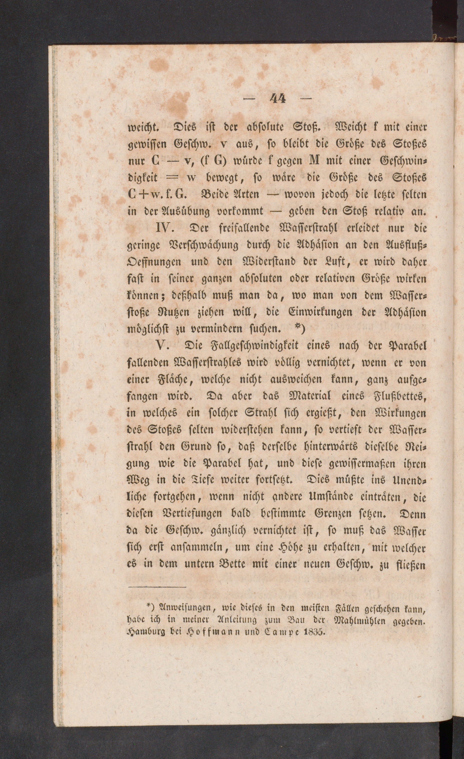 IV. Der srcifallende Wasserstrahl erleidet nur diegeringe Vcrschwachung durch die Adhäsion an den Ausfluß-Oeffnungcn und den Widerstand der Luft, er wird daherfast in seiner ganzen absoluten oder relativen Größe wirkenkönnen; deßhalb muß man da, wo man von dem Wasser-stoße Nutzen ziehen will, die Einwirkungen der Adhäsionmöglichst zu vermindern suchen. *)