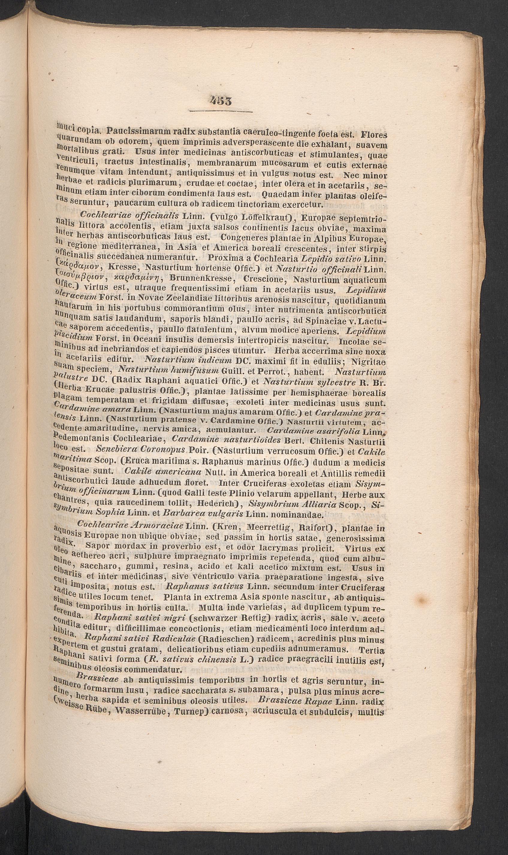Cochleariae ofjicinalis Linn. (vulgo Liiffelkraut), Europae septemtrio-jMlis littora accolentis, etiam juxta salsos continentis lacus obviae, maxima."ter herbas antiscorbuticas laus est. Congeneres plantae in Alpibus Europae,M regione mediterranea, in Asia et America boreali crescentes, inter stirpis0'ficinalis succedanea numerantur. Proxima a Cochlearia Lepidio salivo Linn.l* K (>(S'a«oj», Kresse, Nasturtium hortense Offic.) et Nasturtio officinalilAnn.