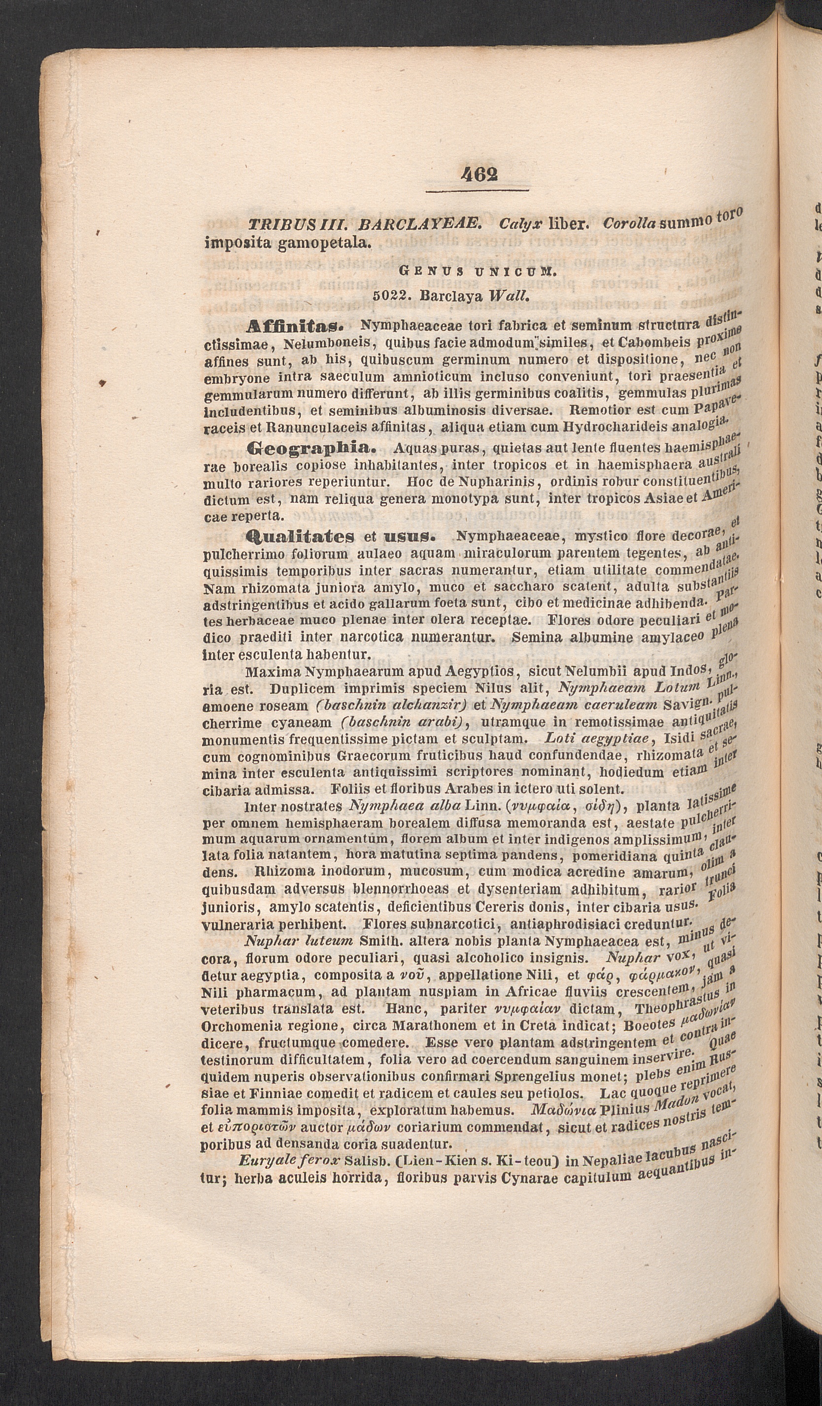 Qualitates et USUS. Nymphaeaceae, mystico flore decora e ’pulcherrimo foliorum aulaeo aquam miraculorum parentem tegentes, aB Ae-quissimis temporibus inter sacras numerantur, etiam utilitate comme»® 1 *^Nam rhizomata juniora amylo, muco et saccharo scatent, adulta subst® 1adstringentibus et acido gallarum foeta sunt, cibo et medicinae adhibenda- "‘g,tes herbaceae muco plenae inter olera receptae. Flores odore peculiari et %dico praediti inter narcotica numerantur. Semina albumine amylaceo P einter esculenta habentur. m-