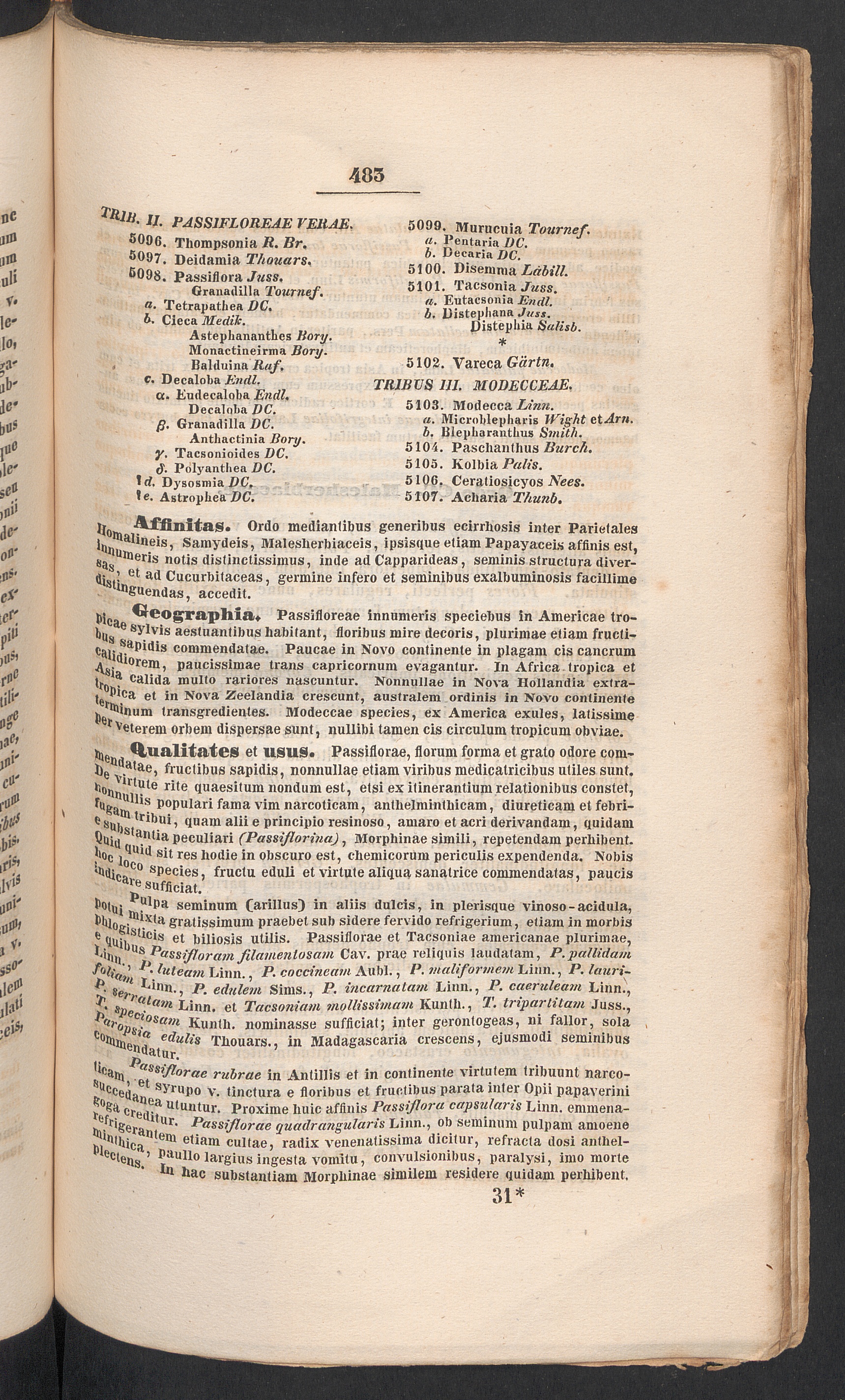 Geographia. Passifloreae innumeris speciebus in Americae tro-bl, s e s ylvis aestuantibus habitant, floribus mire decoris, plurimae etiam fructi-c^PHis commendatae. Paucae in Novo continente in plagam cis cancrum^ “Utrem, paucissimae trans Capricornum evagantur. In Africa tropica ett, , calida multo rariores nascuntur. Nonnullae in Nova Hollandia extra-te ^ lca et Ul Nova Zeelandia crescunt, australem ordinis in Novo continentev ^inum transgredientes. Modeccae species, ex America exules, latissime( Veterem orbem dispersae sunt, nullibi tamen cis circulum tropicum obviae.