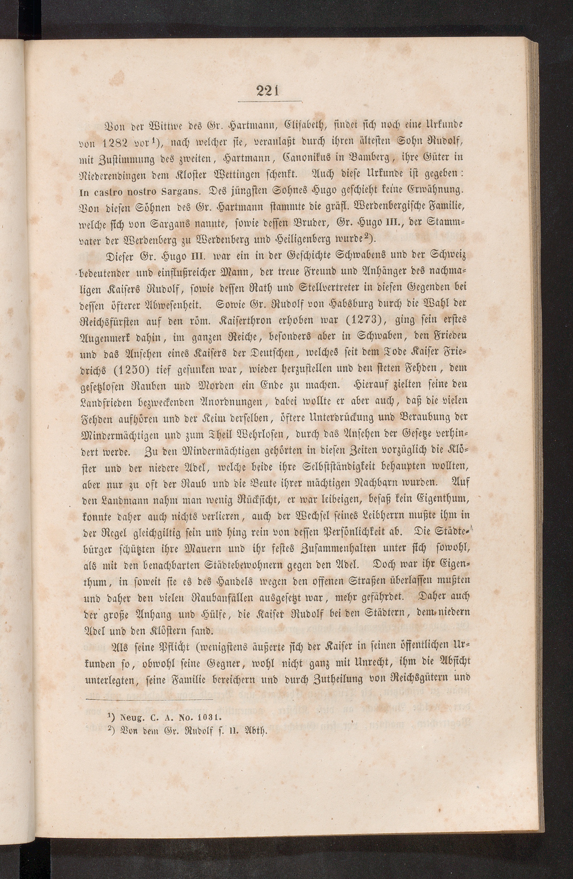 Dieser Gr. Hugo in. war ein in der Geschichte Schwabens und der Schweizbedeutender und einflußreicher Mann, der treue Freund und Anhänger des nachma-ligen Kaisers Rudolf, sowie dessen Rath und Stellvertreter in diesen Gegenden beidessen öfterer Abwesenheit. Sowie Gr. Rudolf von Habsburg durch die Wahl derReichsfürsten auf den röm. Kaiserthron erhoben war (1273), ging sein erstesAugenmerk dahin, im ganzen Reiche, besonders aber in Schwaben, den Friedenund das Ansehen eines Kaisers der Deutschen, welches seit dem Tode Kaiser Frie-drichs (1250) tief gesunken war, wieder herzustellen und den steten Fehden, demgesetzlosen Rauben und Morden ein Ende zu machen. Hierauf zielten seine denLandfrieden bezweckenden 'Anordnungen, dabei wollte er aber auch, daß die vielenFehden aufhören und der Keim derselben, öftere Unterdrückung und Beraubung derMindermächtigen und zum Theil Wehrlosen, durch das 'Ansehen der Gesetze verhin-dert werde. Zu den Mindermächtigen gehörten in diesen Zeiten vorzüglich die Klö-ster und der niedere Adel, welche beide ihre Selbstständigkeit behaupten wollten,aber nur zu oft der Raub und die Beute ihrer mächtigen Nachbarn wurden. Aufden Landmann nahm man wenig Rücksicht, er war leibeigen, besaß kein Eigenthum,konnte daher auch nichts verlieren, auch der Wechsel seines Leibherrn mußte ihm inder Regel gleichgiltig sein und hing rein von dessen Persönlichkeit ab. Die Städte-'kürzer schützten ihre Mauern und ihr festes Zusammenhalten unter sich sowohl,als mit den benachbarten Städtebewohnern gegen den Adel. Doch war ihr Eigen-thum , in soweit sie es des Handels wegen den offenen Straßen überlassen mußtenund daher den vielen Raubanfällen ausgesetzt war, mehr gefährdet. Daher auchder große Anhang und Hülfe, die Kaiser Rudolf beiden Städtern, dem,niedernAdel und den Klöstern fand.