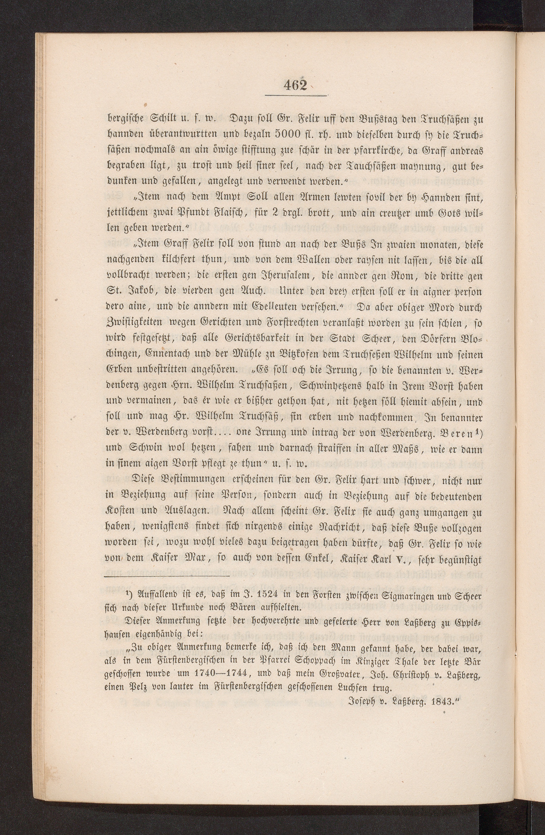 »Item Grass Felir soll von stund an nach der Bußs In zwaien monaten, diesenachgenden kilchfert thun, und von dem Wallen oder raysen nit lassen, bis die allvollbracht werden; die ersten gen Jherusalem, die anndcr gen Rom, die dritte genSt. Jakob, die vierden gen Auch. Unter den drey ersten soll er in aigner Persondero aine, und die anndern mit Edelleuten versehen." Da aber obiger Mord durchZwistigkeiten wegen Gerichten und Forstrechten veranlaßt worden zu sein schien, sowird festgesetzt, daß alle Gerichtsbarkeit in der Stadt Scheer, den Dörfern Blo-chingen, Ennentach und der Mühle zn Bitzkofen dem Truchseßen Wilhelm und seinenErben unbestritten angehören. »Es soll och die Irrung, so die benannten v. Wer-denberg gegen Hrn. Wilhelm Truchsaßen, Schwinyetzens halb in Jrem Borst habenund vermainen, das ör wie er bißher gethon hat, nit hetzen soll hiemit absein, undsoll und mag Hr. Wilhelm Truchsaß, sin erben und nachkommen. In benannter