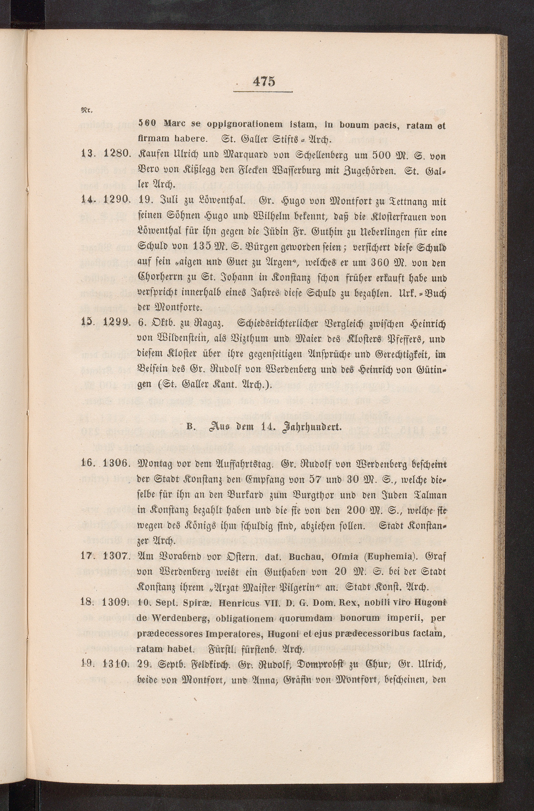 seinen Söhnen Hugo und Wilhelm bekennt, daß die Klosterfrauen vonLöwenthal für ihn gegen die Jüdin Fr. Guthin zu Ueberlingen für eineSchuld von 135 M. S. Bürgen geworden seien j versichert diese Schuldauf sein „aigen und Guet zu Argen", welches er um 360 M. von denChorherrn zu St. Johann in Konstanz schon früher erkauft habe undverspricht innerhalb eines Jahres diese Schuld zu bezahlen. Urk.-Buchder Montforte.