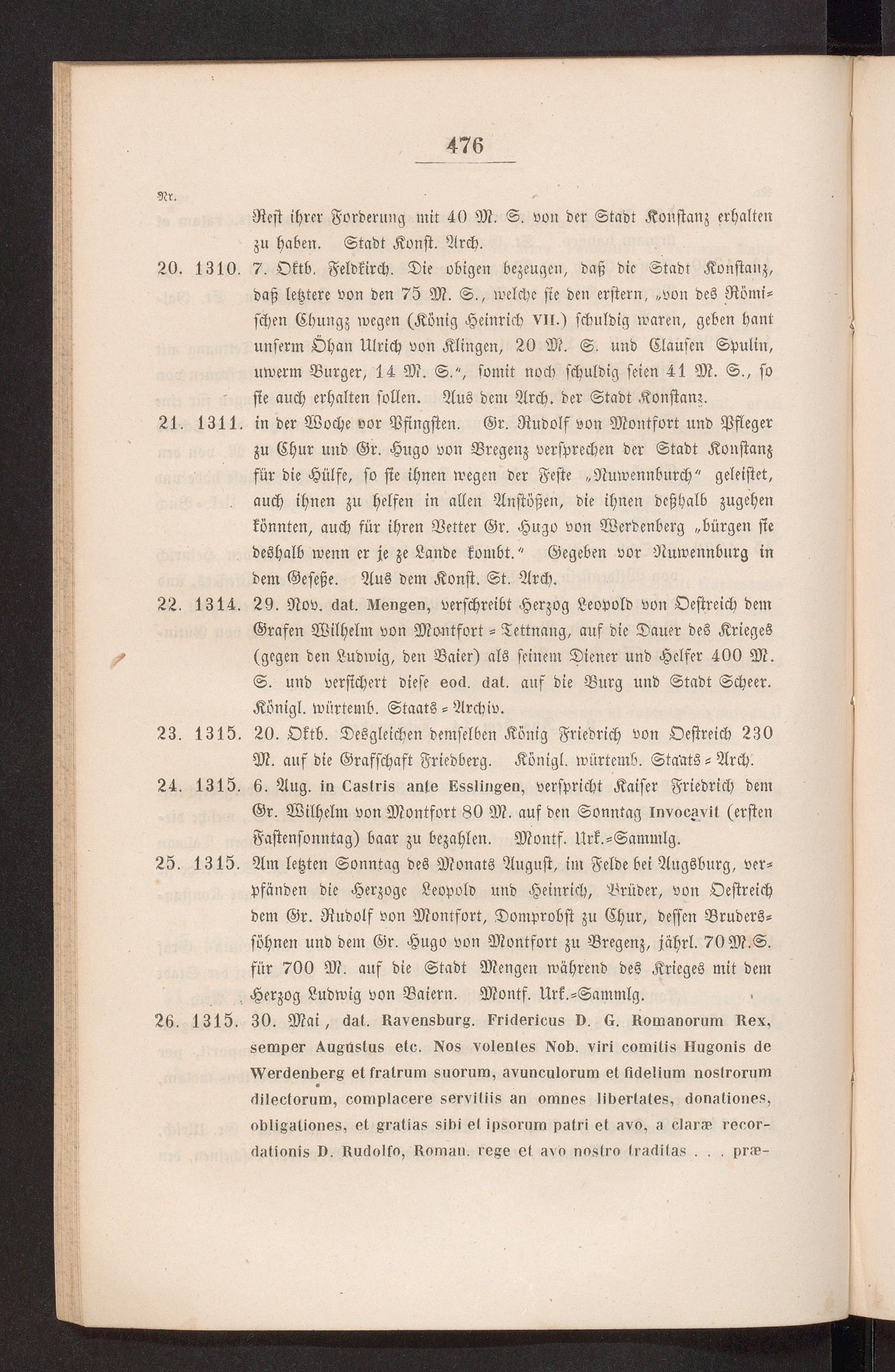 pfänden die Herzoge Leopold und Heinrich, Prüder, von Oestreichdem Gr. Rudolf von Montfort, Domprobst zu Chur, dessen Bruders-söhnen und dem Gr. Hugo von Montfort zu Bregenz, jährl. 70M.S.für 700 M. auf die Stadt Mengen während des Krieges mit dem, Herzog Ludwig von Baiern. Montf. Urk.-Sammlg.