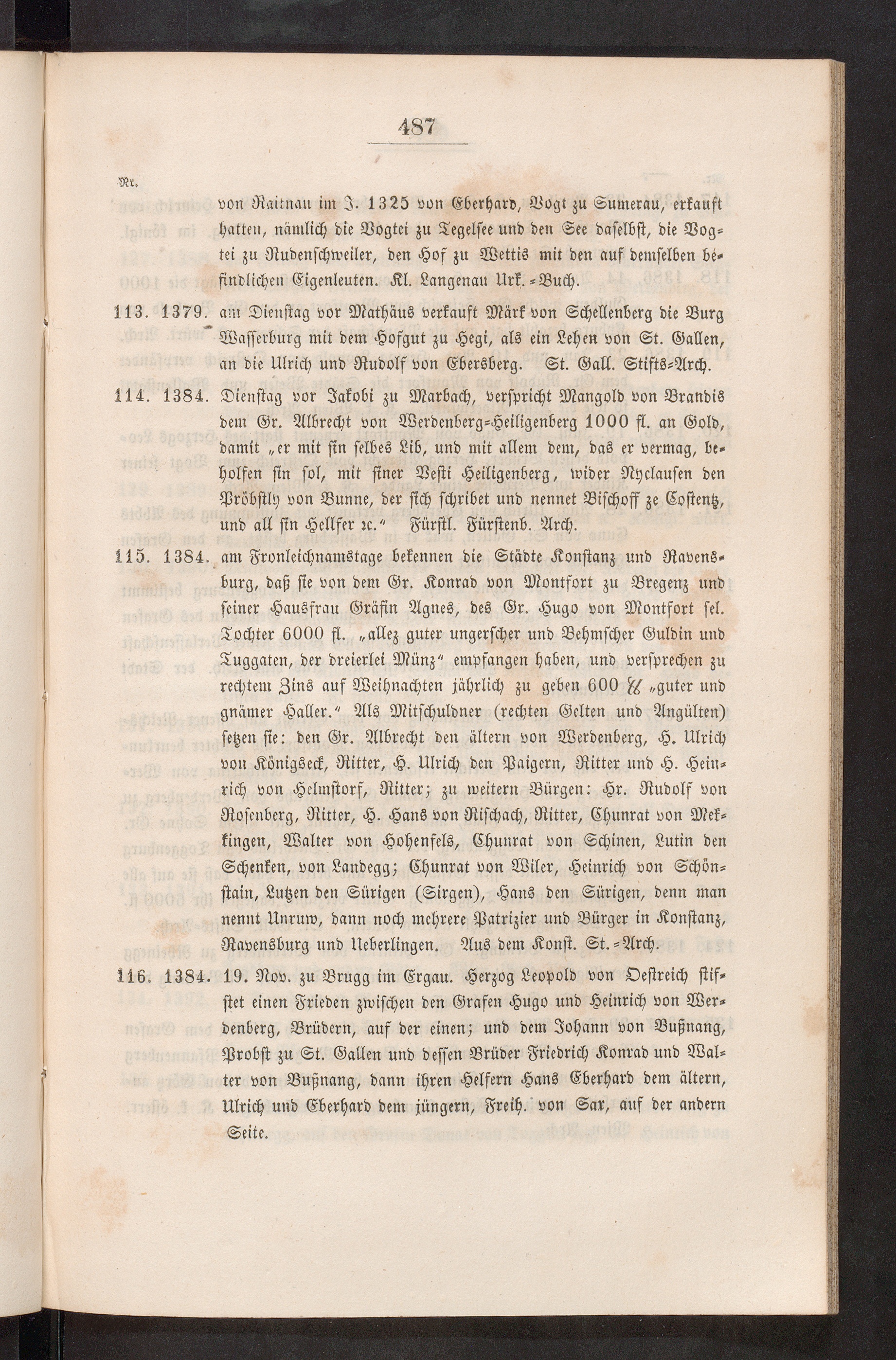 stet einen Frieden zwischen den Grafen Hugo und Heinrich von Wer-denberg, Brudern, auf der einen; und dem Johann von Bußnang,Probst zu St. Gallen und dessen Brüder Friedrich Konrad und Wal-ter von Bußnang, dann ihren Helfern Hans Eberhard dem ältern,Ulrich und Eberhard dem jünger», Freih. von Sar, auf der andernSeite.