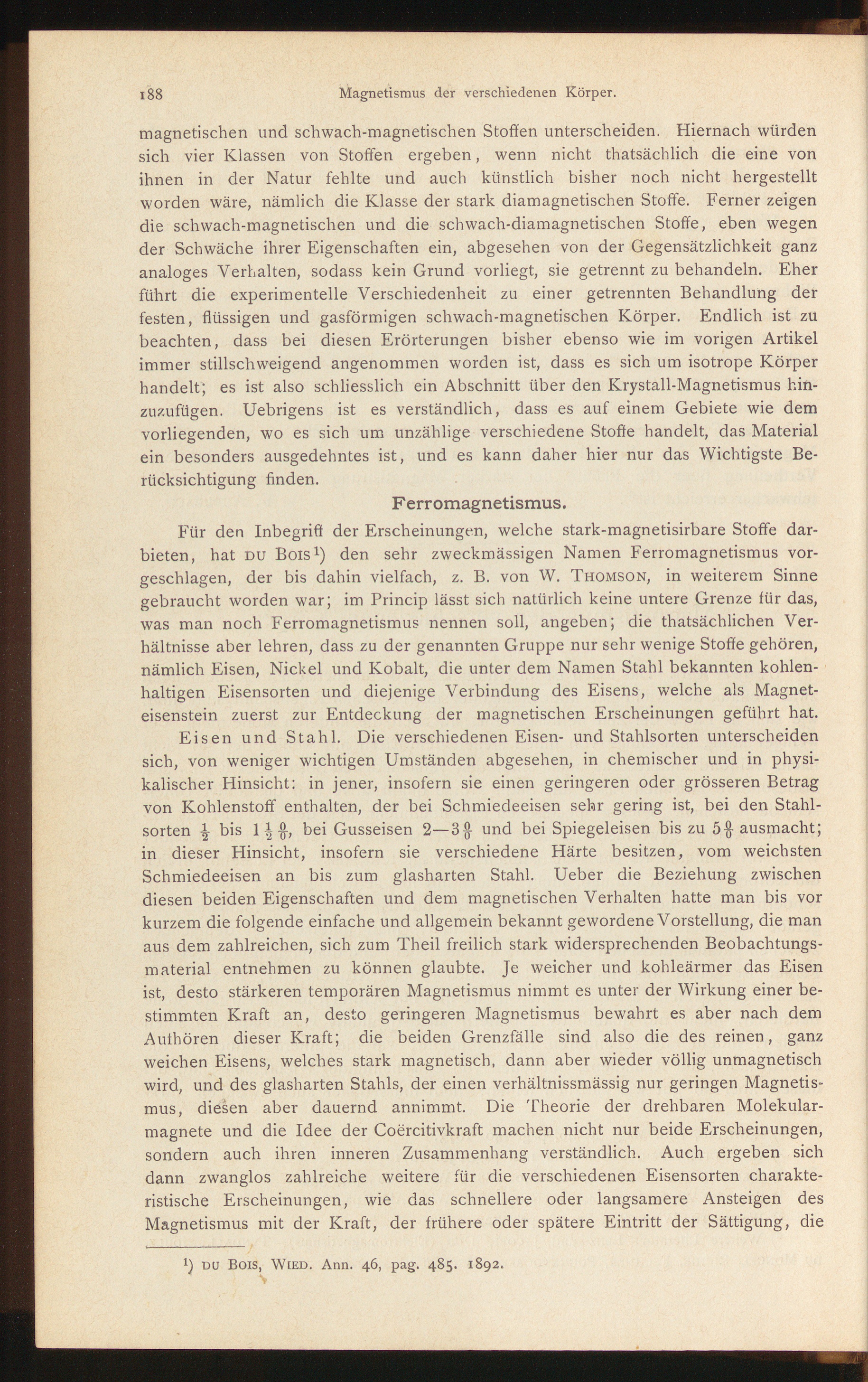 Für den Inbegriff der Erscheinungen, welche stark-magnetisirbare Stoffe dar-bieten, hat du Bois 1 ) den sehr zweckmässigen Namen Ferromagnetismus vor-geschlagen, der bis dahin vielfach, z. B. von W. Thomson, in weiterem Sinnegebraucht worden war; im Princip lässt sich natürlich keine untere Grenze für das,was man noch Ferromagnetismus nennen soll, angeben; die thatsächlichen Ver-hältnisse aber lehren, dass zu der genannten Gruppe nur sehr wenige Stoffe gehören,nämlich Eisen, Nickel und Kobalt, die unter dem Namen Stahl bekannten kohlen-haltigen Eisensorten und diejenige Verbindung des Eisens, welche als Magnet-eisenstein zuerst zur Entdeckung der magnetischen Erscheinungen geführt hat.