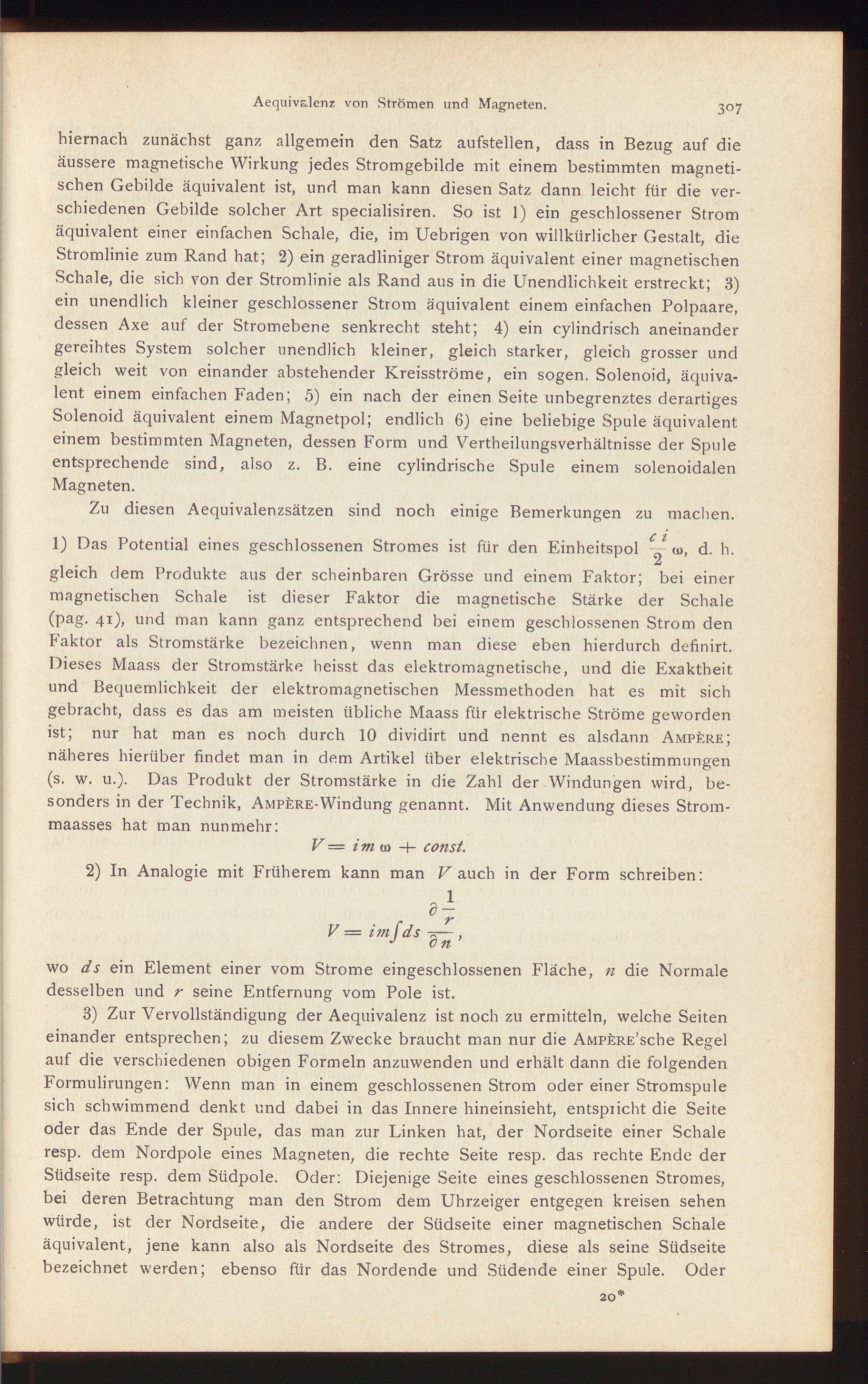 3) Zur Vervollständigung der Aequivalenz ist noch zu ermitteln, welche Seiteneinander entsprechen; zu diesem Zwecke braucht man nur die AMPfeRE’sche Regelauf die verschiedenen obigen Formeln anzuwenden und erhält dann die folgendenFormulirungen: Wenn man in einem geschlossenen Strom oder einer Stromspulesich schwimmend denkt und dabei in das Innere hineinsieht, entspiicht die Seiteoder das Ende der Spule, das man zur Linken hat, der Nordseite einer Schaleresp. dem Nordpole eines Magneten, die rechte Seite resp. das rechte Ende derSüdseite resp. dem Südpole. Oder: Diejenige Seite eines geschlossenen Stromes,bei deren Betrachtung man den Strom dem Uhrzeiger entgegen kreisen sehenwürde, ist der Nordseite, die andere der Südseite einer magnetischen Schaleäquivalent, jene kann also als Nordseite des Stromes, diese als seine Südseitebezeichnet werden; ebenso für das Nordende und Südende einer Spule. Oder